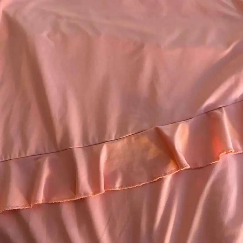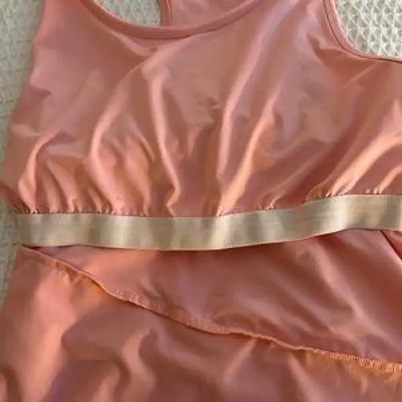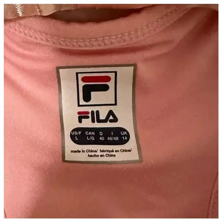 Womens Ruffle trim racerback tank, 84% polyester, 16% Spandex; Size L. Shelf bra. 24" shoulder to hem. 17" pit to pit. silver FILA official logo tag on lower right side.