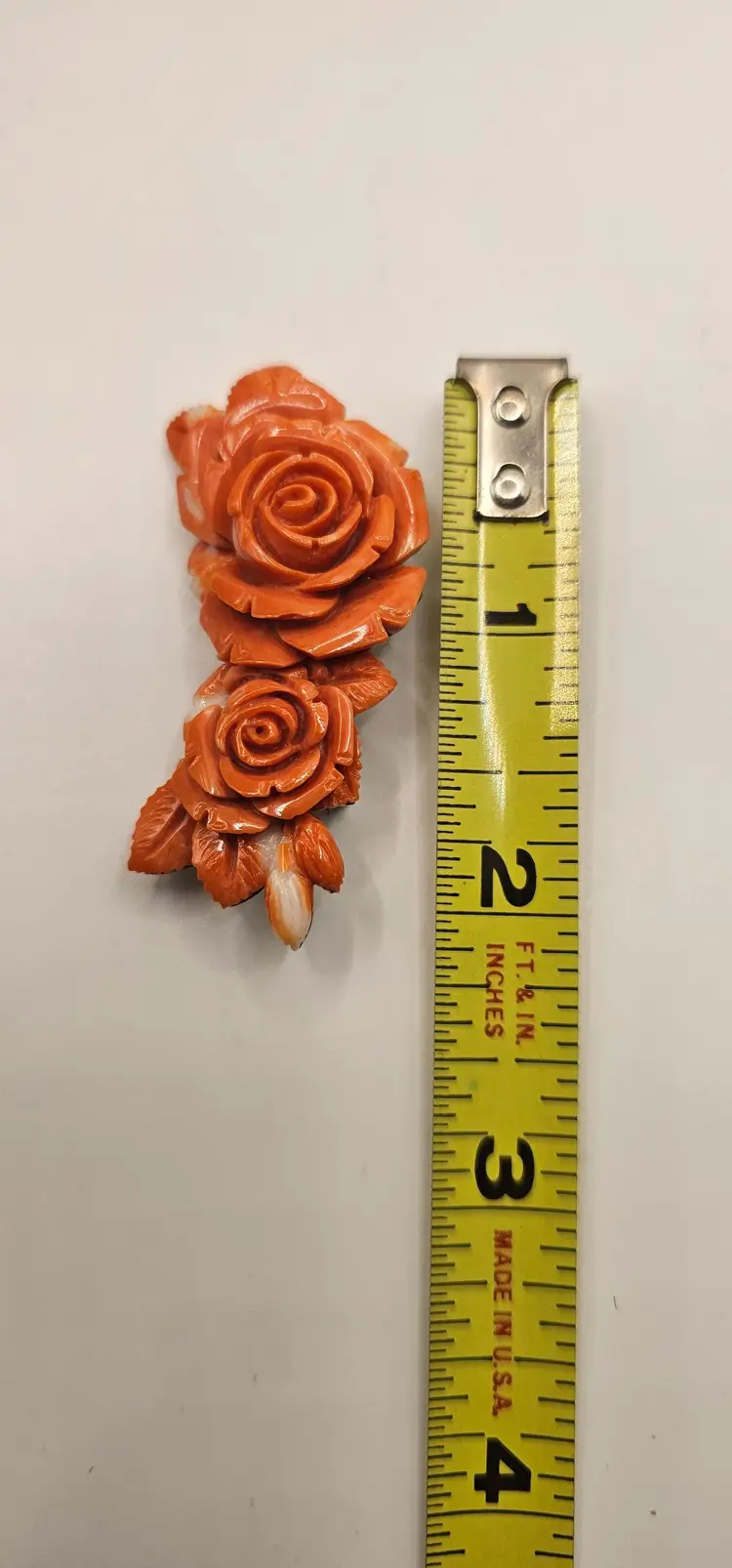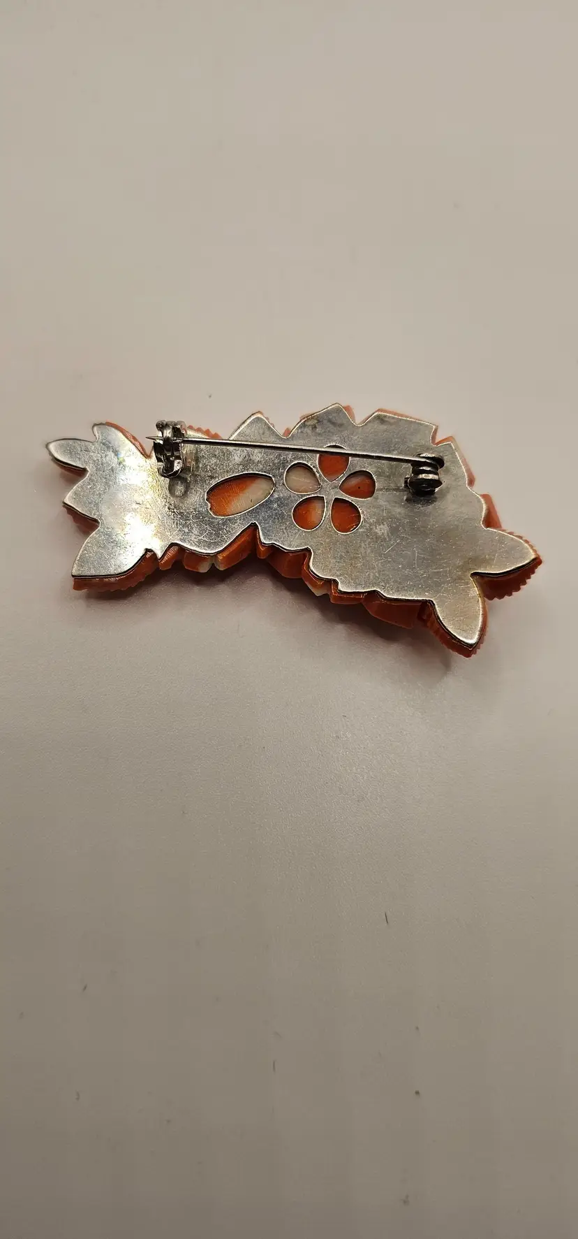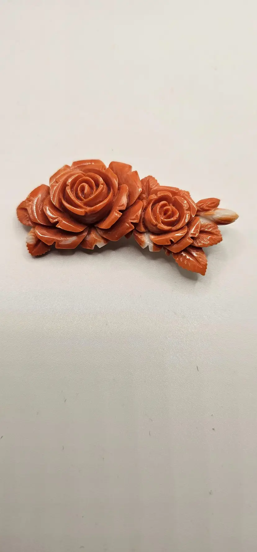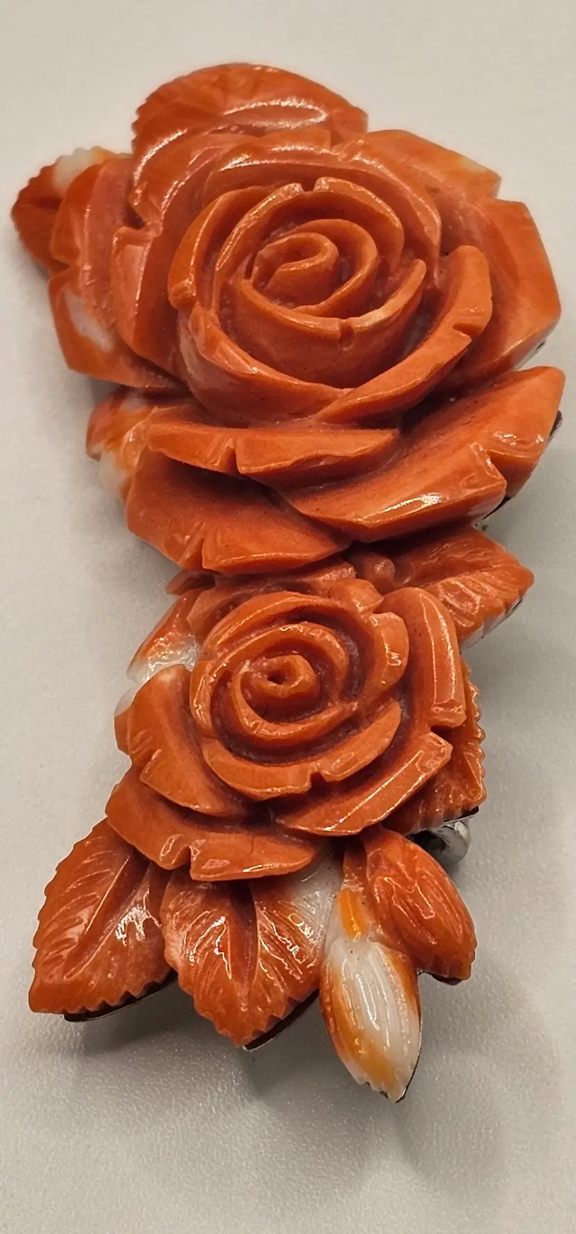 Beautiful coral carved brooch. The metal backing is not marked. It does not magnetize.