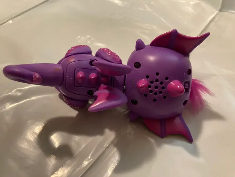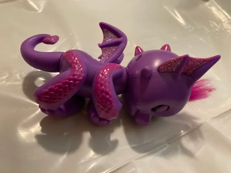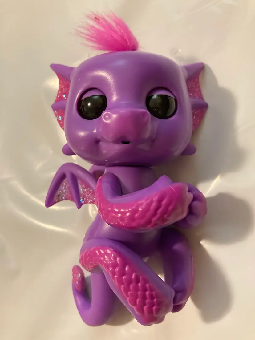 Interactive by: being swung, petted, rocked, startled or hung upside down. Blinks eyes, turns head & makes fun baby dragon noises lol. It will attach to fingers. Purple & Pink. Works. #3584