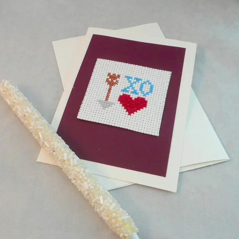 *Hand stitched XO, Arrow and Heart Dark Burgundy background *XOXO in red and pink Stitched on black Aida cloth Red Check background Silver bow accent *Each Card is Approx. 5"x 3 1/2" *Blank inside to add your own personal message