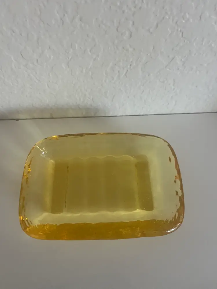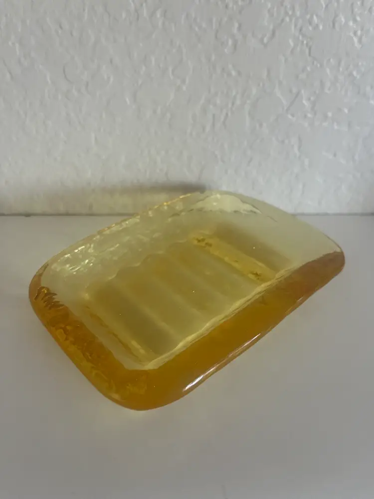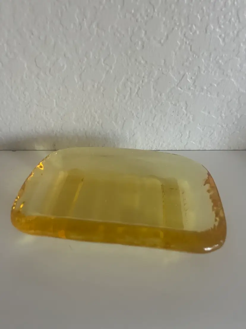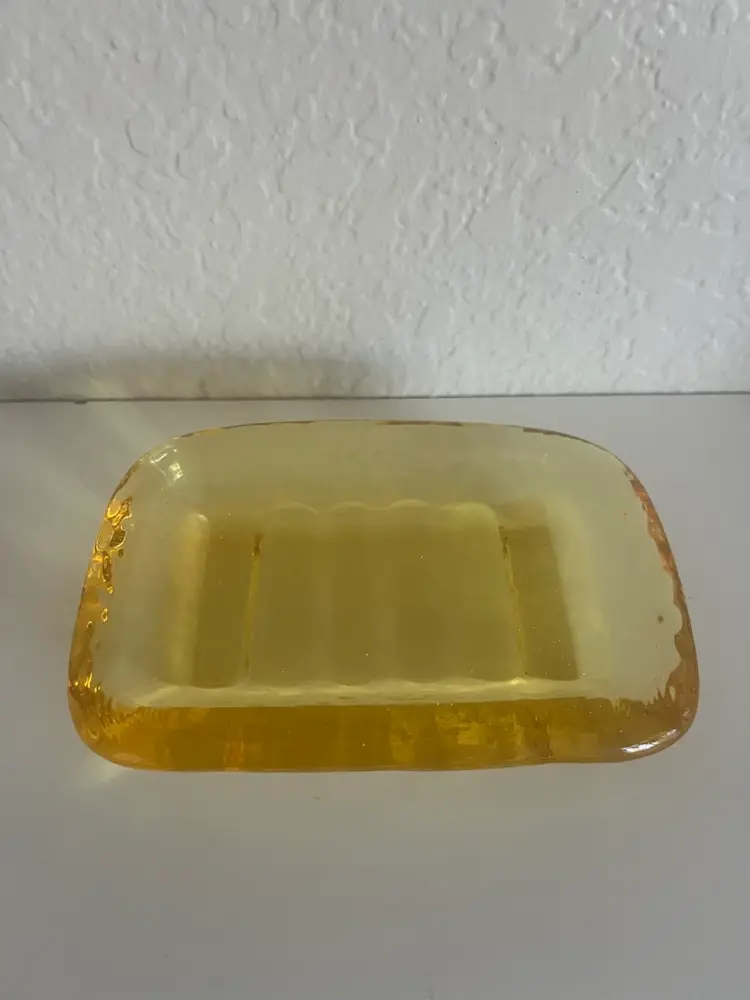 This is a Fire & Light Recycled Art Glass Soap Dish in Citrus color. Made from recycled glass. Features a poured glass mold design. Suitable for use as a soap dish or trinket dish.