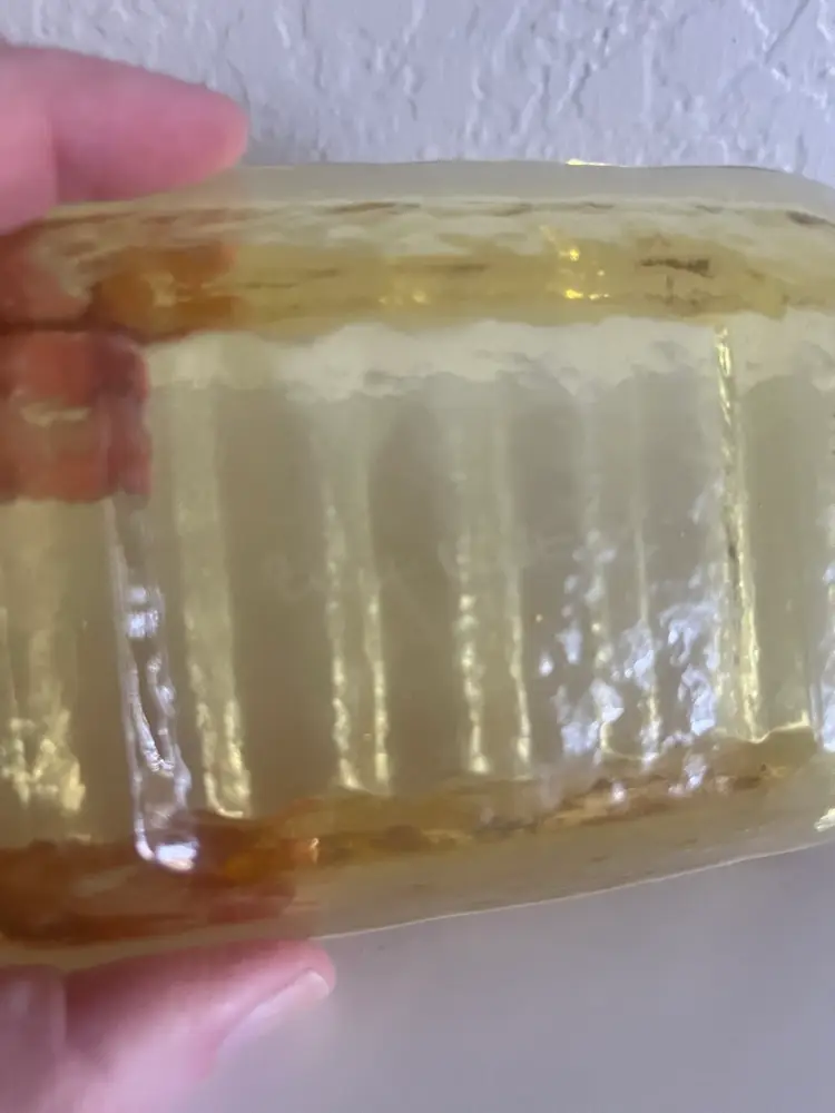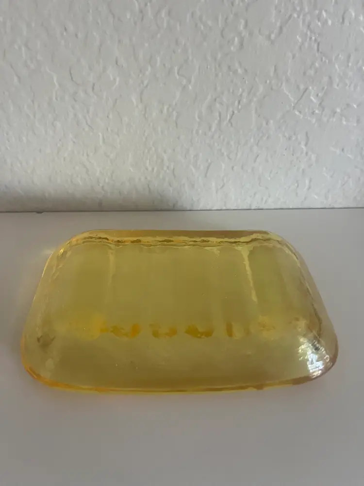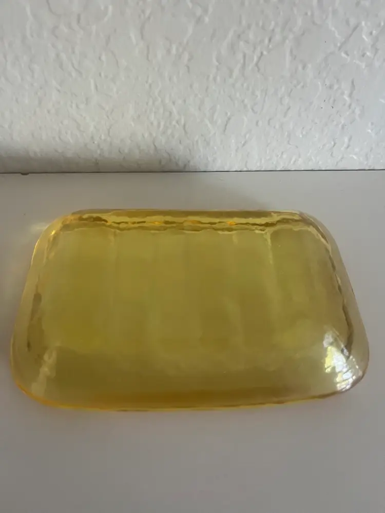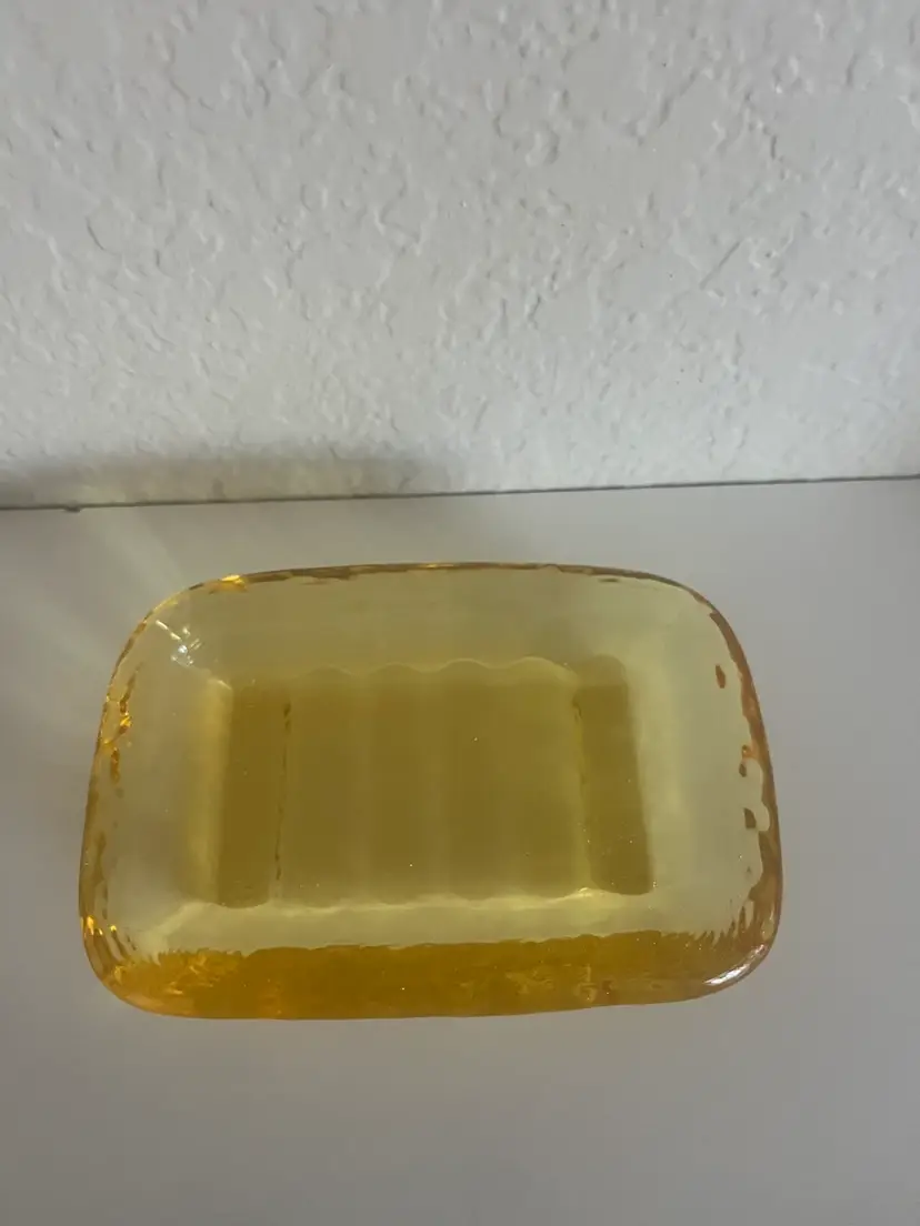 This is a Fire & Light Recycled Art Glass Soap Dish in Citrus color. Made from recycled glass. Features a poured glass mold design. Suitable for use as a soap dish or trinket dish.
