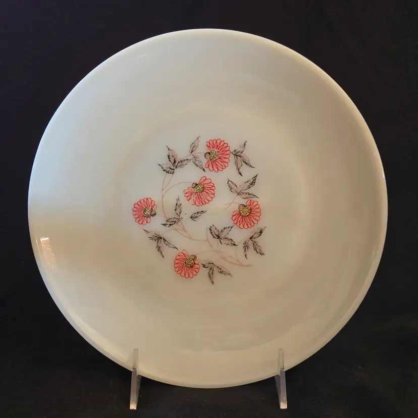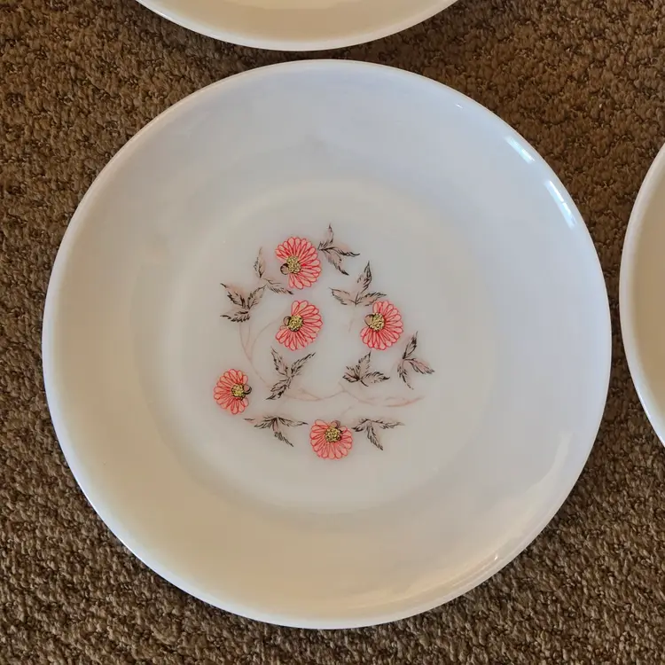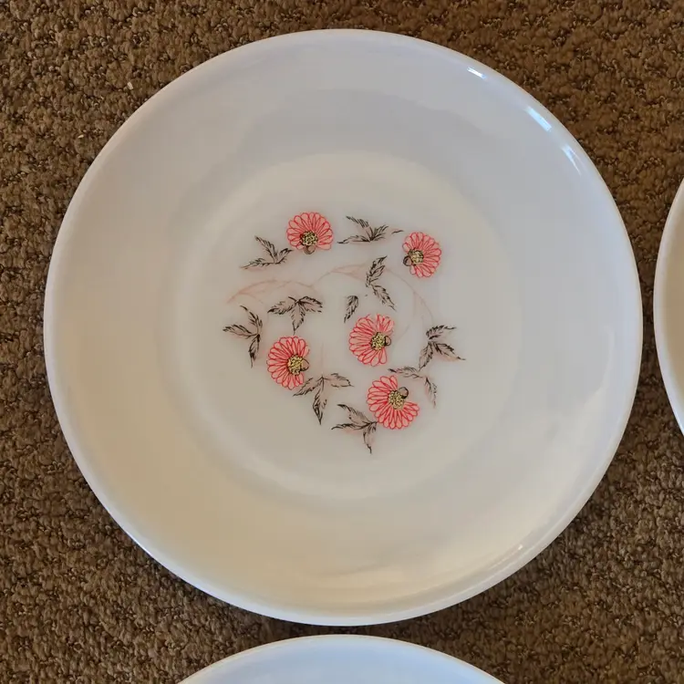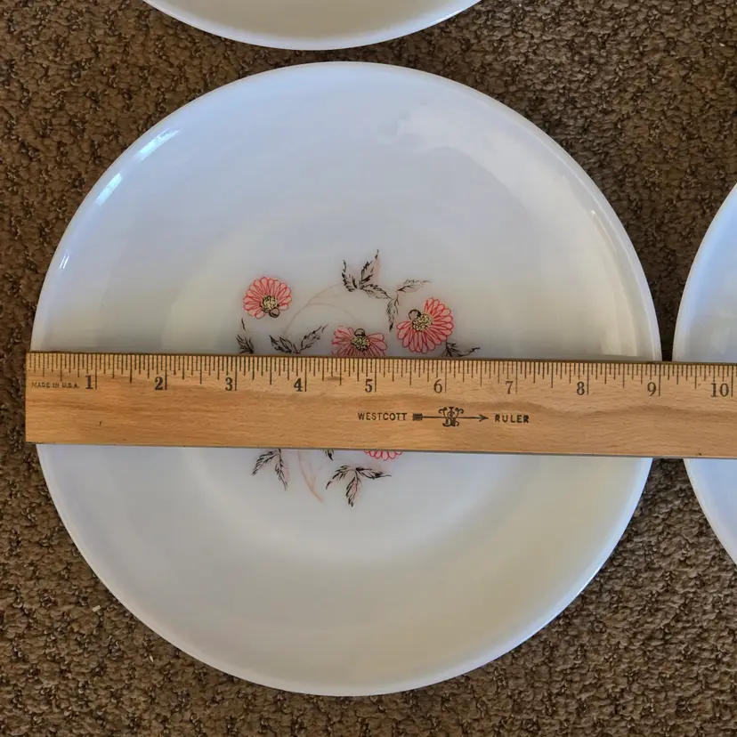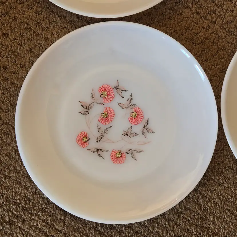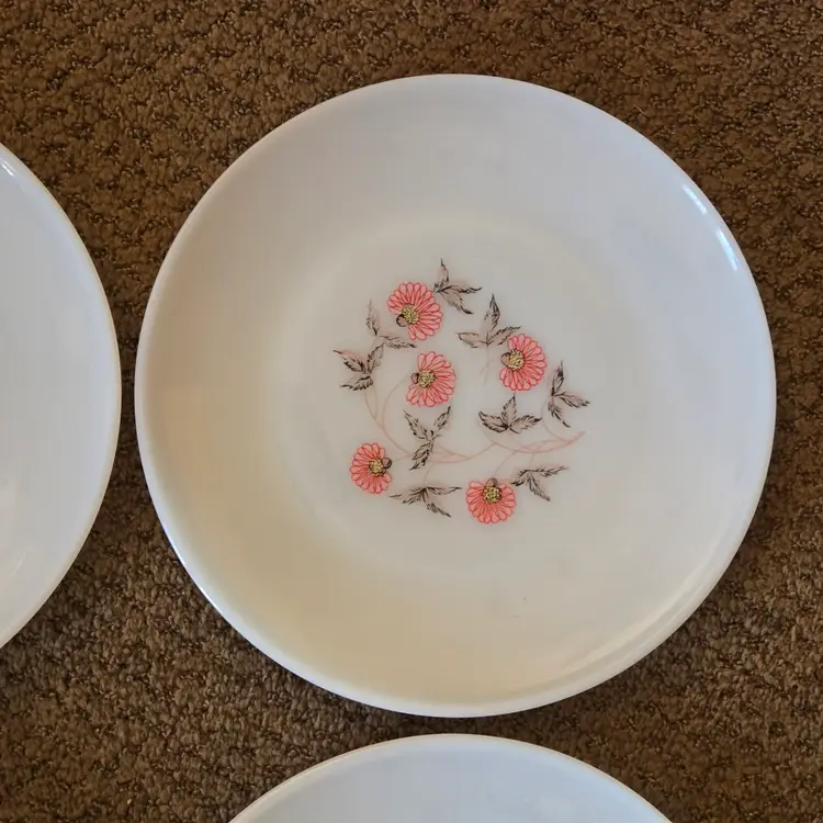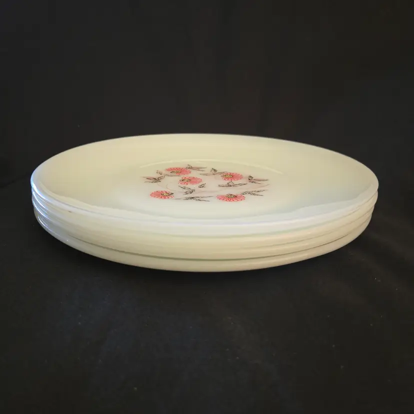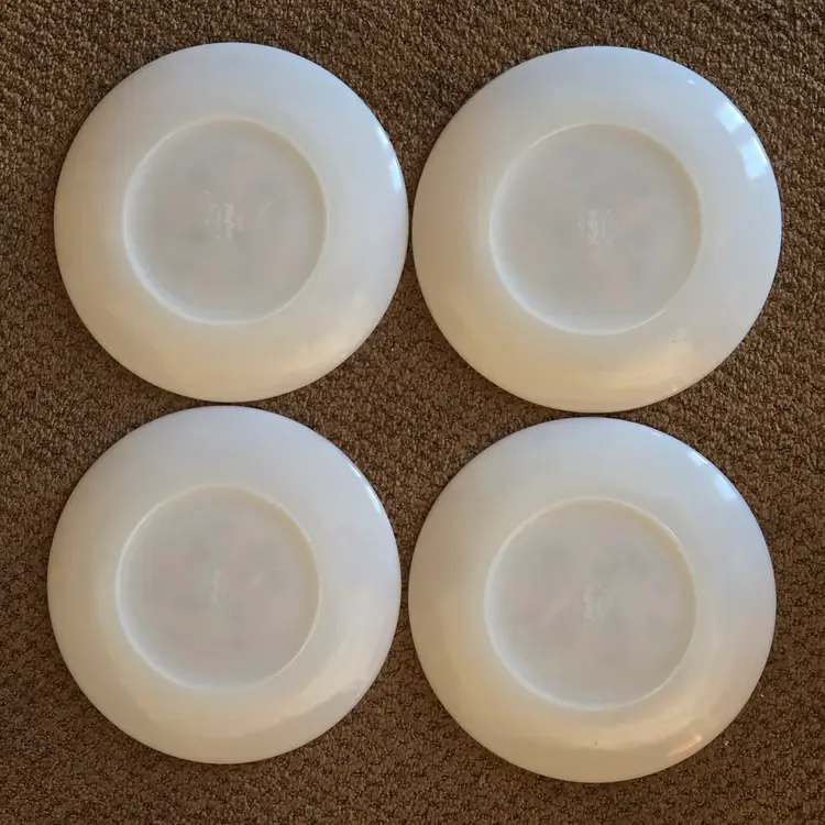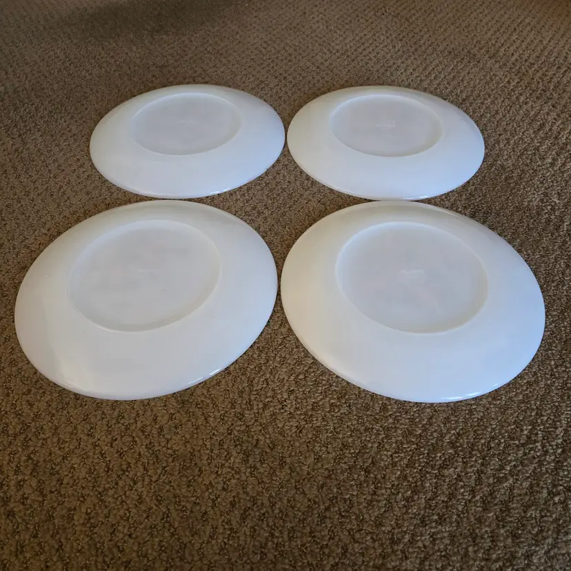 Set of 4 Fire King Fleurette Dinner Plate Milk Glass Anchor Hocking 9" Diameter Vintage. Used condition with a bit of dirt and stains, some scratches from use and maybe some fading to color. Please view all the photos and please ask any questions prior to purchase when possible.