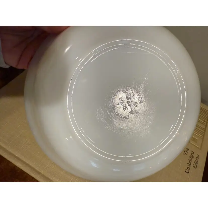 Vintage Fire King Gold Rimmed Milk Glass 8" Serving Bowl, a classic piece of tableware perfect for any occasion. This beautiful white milk glass bowl features an elegant gold rim, adding a touch of sophistication to your serving collection. Ideal for salads, sides, or decorative display, this bowl is a durable and timeless addition to your home. Excellent pre-owned condition with no chips or cracks. Subtle signs of age may be present on the gold rim, consistent with vintage items. Marked 'OVEN WARE' and '12' on the base.