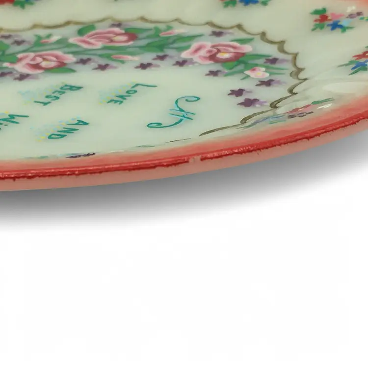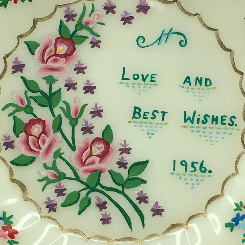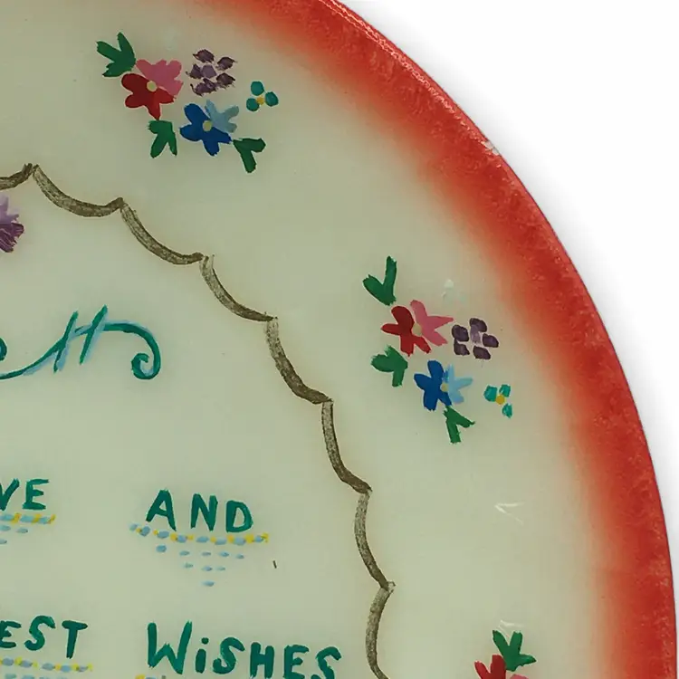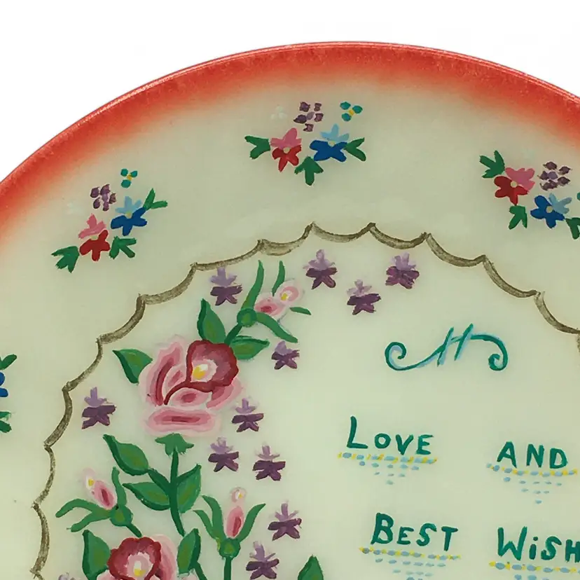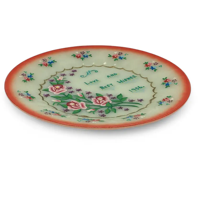 ** The plate is hand painted with a red rim, floral border and a rose floral center with the inscription "LOVE AND BEST WISHES 1956"
