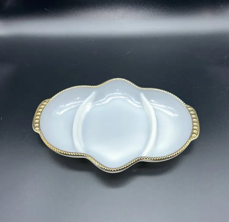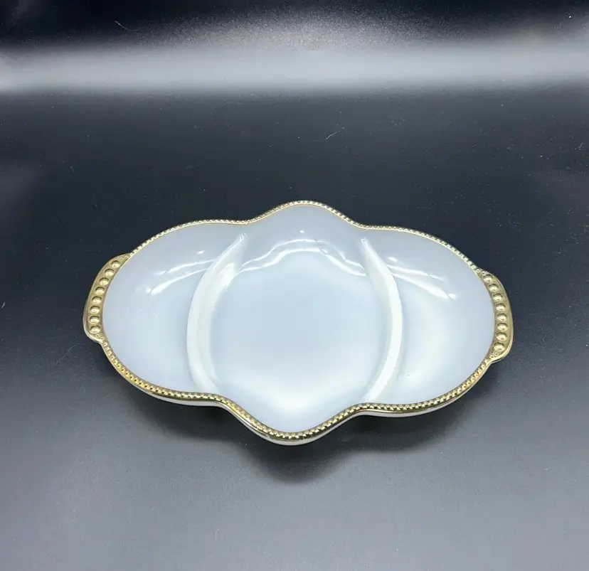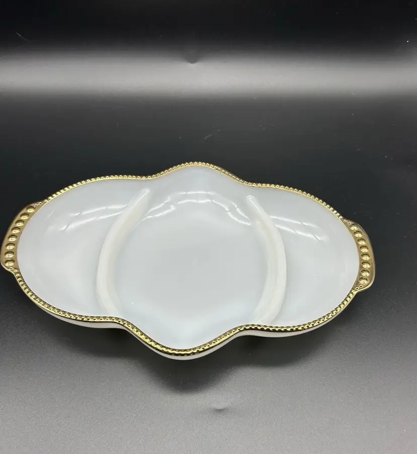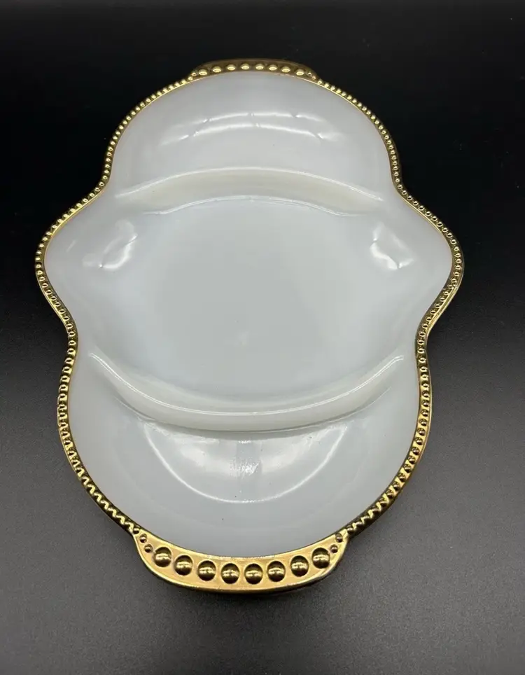 FIRE KING White Milk Glass Divided Relish Dish Anchor Hocking Gold Trim Vintage