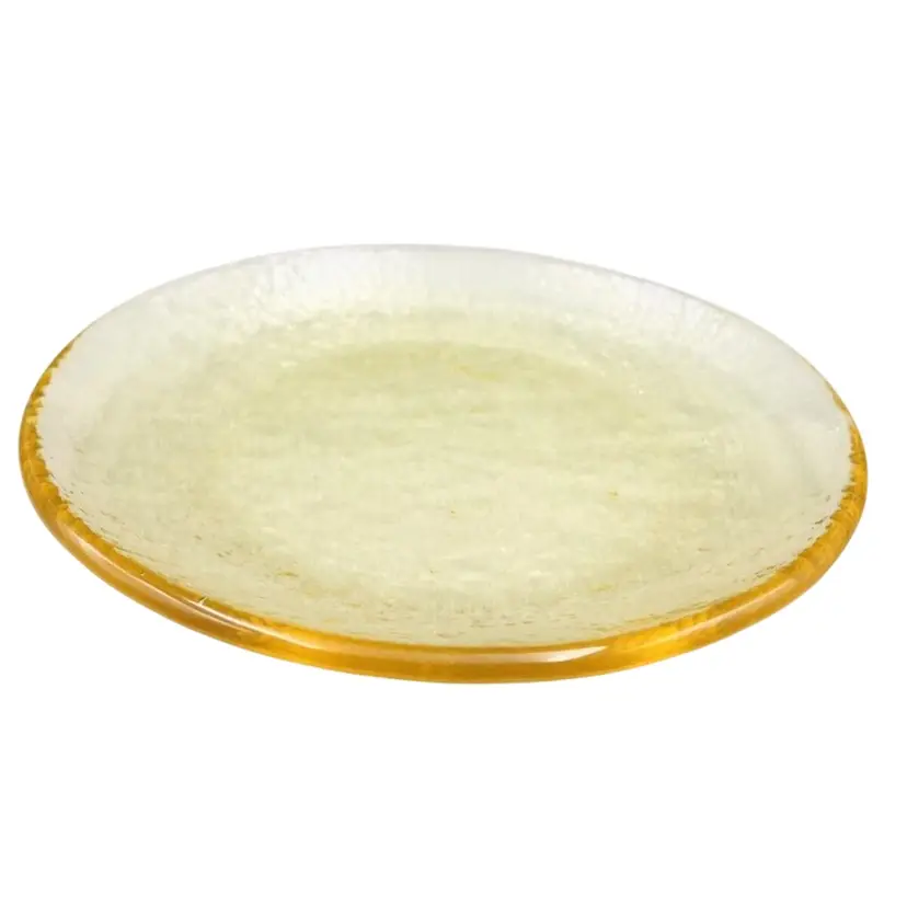 Add a pop of color to your table setting with this Fire & Light Recycled Glass 6.5" Saucer Dessert, Bread Plate in Citrus Yellow. Handmade in California using hand-blown glass production technique, this original piece is a perfect addition to any home. The round-shaped saucer is approximately 6.5 inches in diameter and features a beautiful yellow citrus color that is sure to catch your eye.