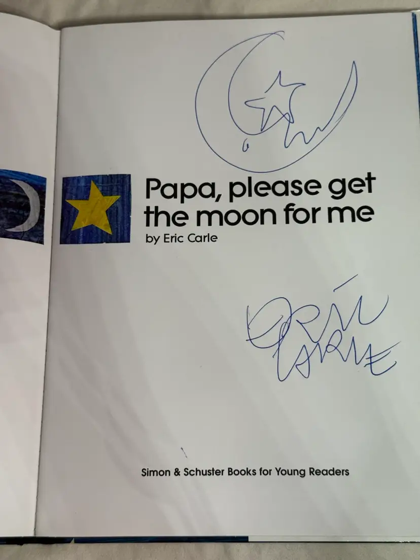 This is a very special and rare book! This is a hard copy Simon & Schuster First Edition of the book that I personally had Eric Carle sign. Please look at the page where the signature is. Eric Carle drew a Lille moon and star for me at the top in addition to his signature or autograph