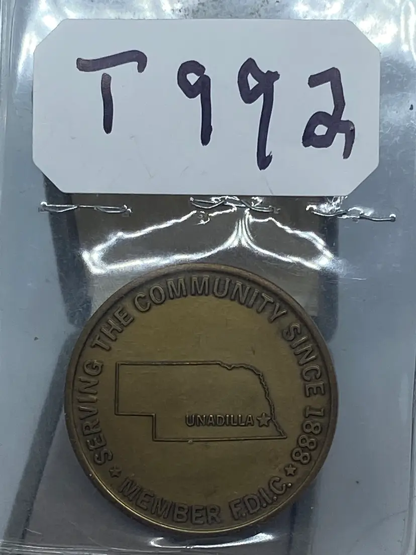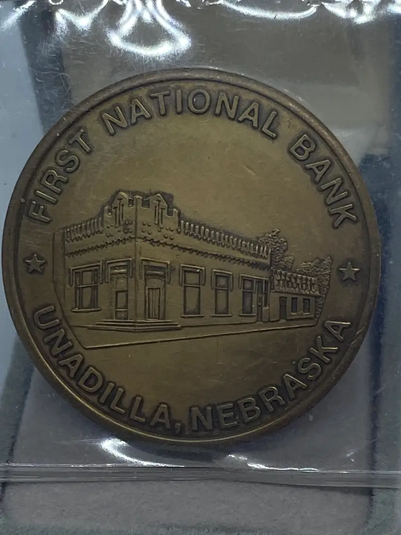 First National Bank Unadilla, Nebraska Since 1888 Medal Lot 992 about 41 mm advertisement medal Please use the pictures above for your description, for they are of the actual item you will be receiving. This is a no return item