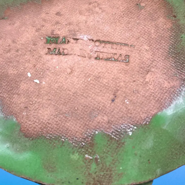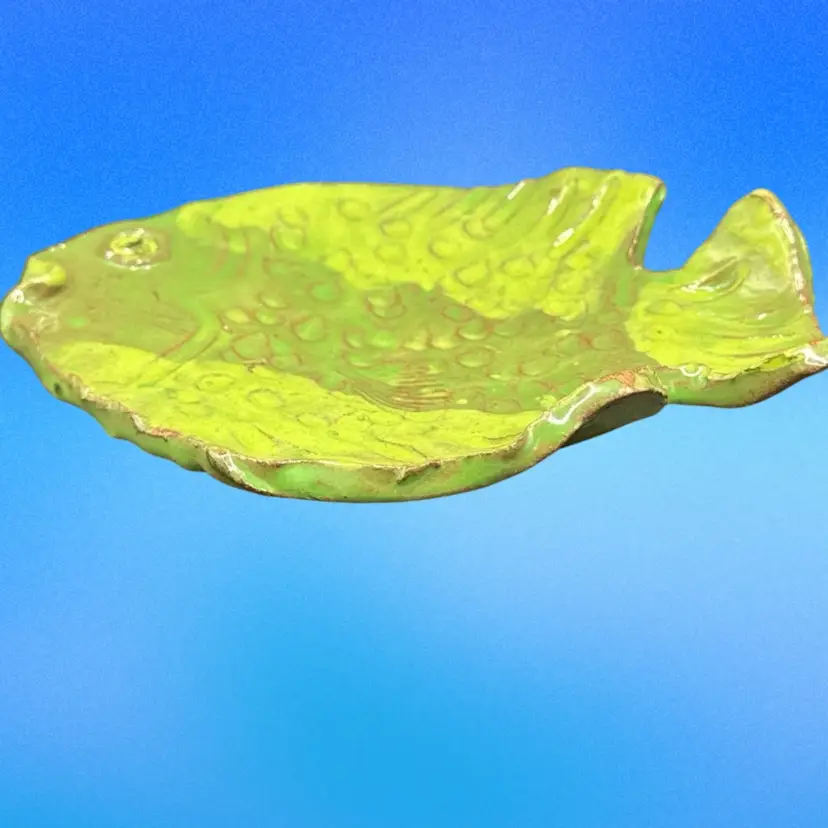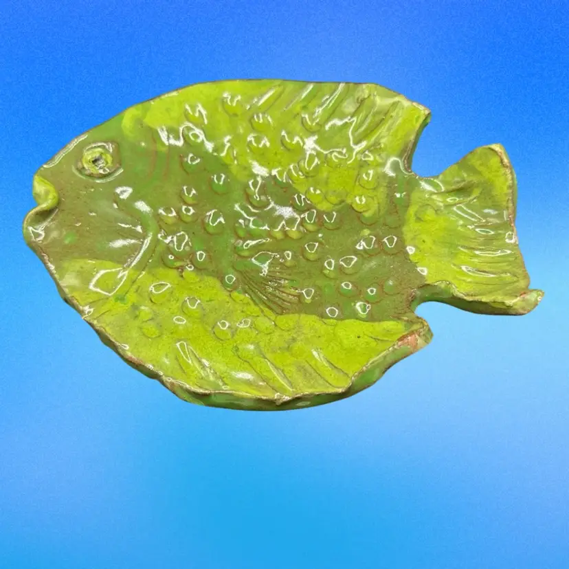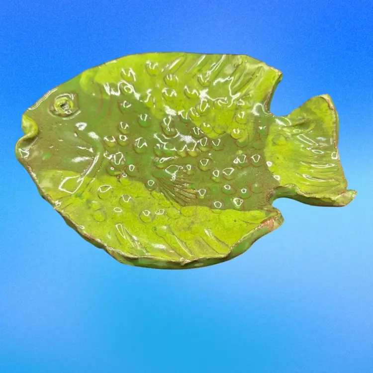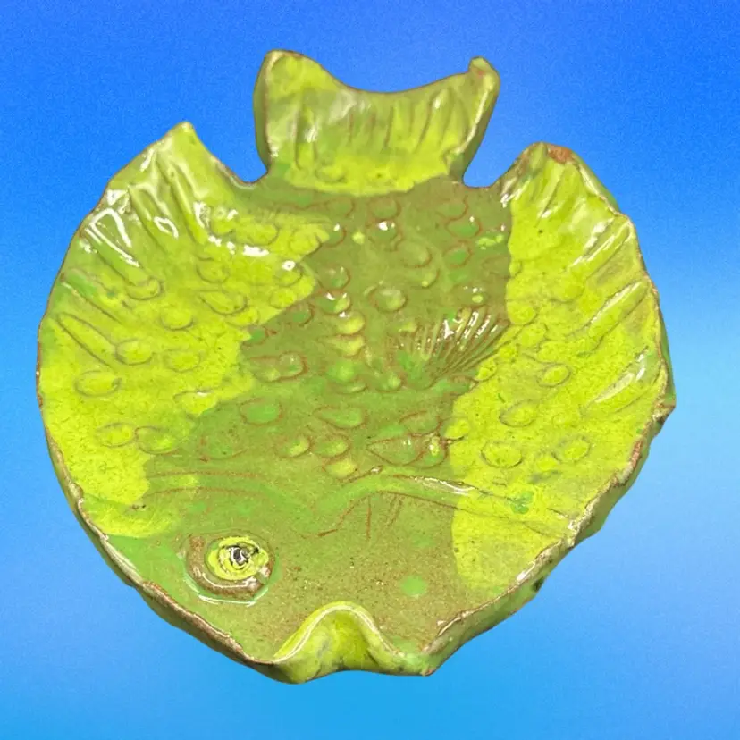 This unique oval-shaped trinket dish is a one-of-a-kind piece of studio art pottery, signed by the artist. The dish features a beautiful fish design, hand-painted on a glossy green clay surface. With a diameter of 7 inches this decorative dish is perfect for storing your small items, such as jewelry. This original piece of contemporary style pottery was made in Texas, USA, using traditional pottery techniques.