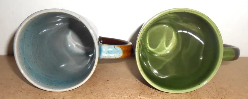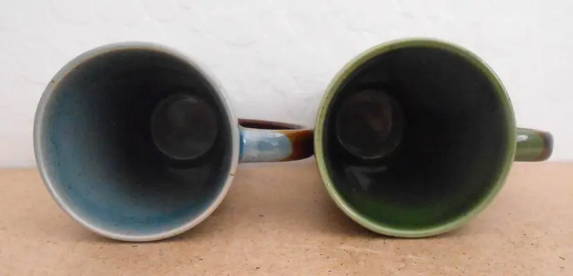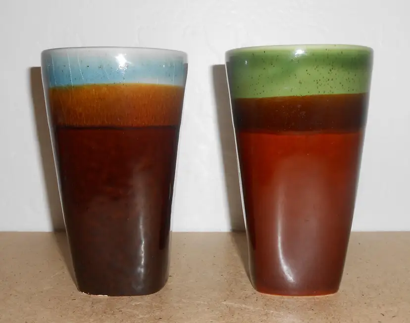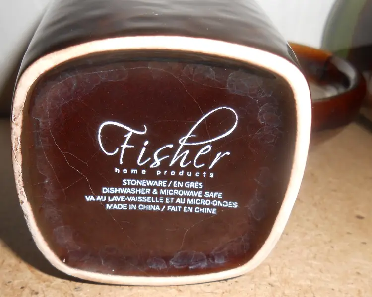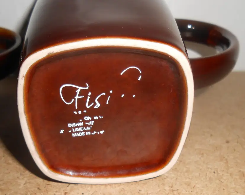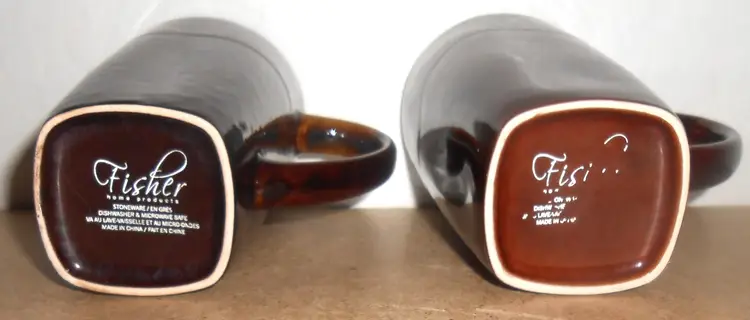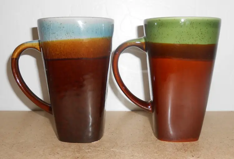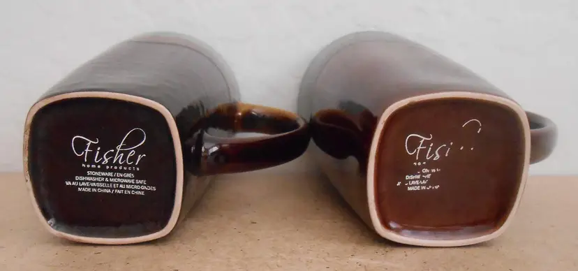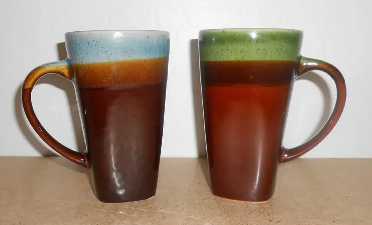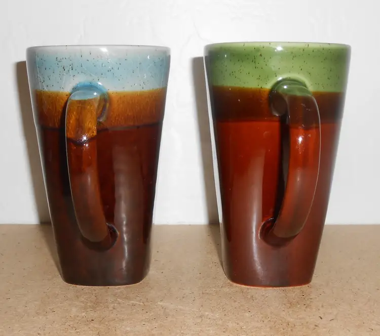 This is a set of two tall latte mugs from Fisher Home Products. The mugs are made of stoneware and come in a brown color. They are suitable for both hot and cold beverages and are machine washable. The set includes two coffee mugs and are 5.5 inches tall.