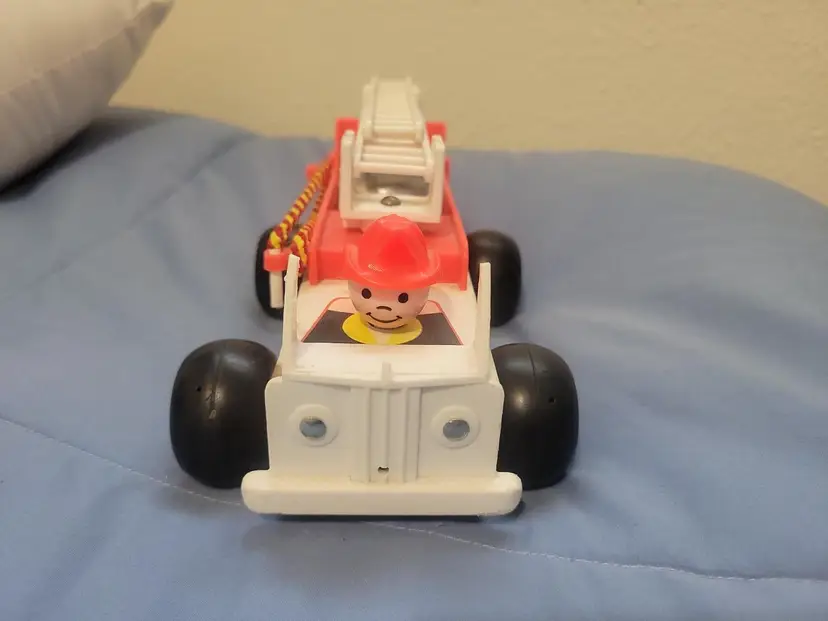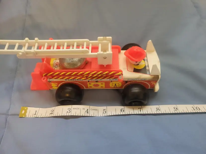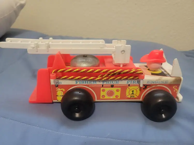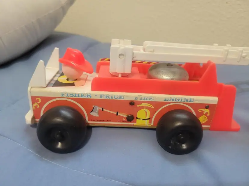 I believe 1963 Fisher price toy firetruck. Has string to pull and driver turns head and bell chimes as you pull toy. Ladder moves around.