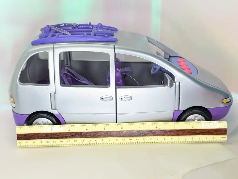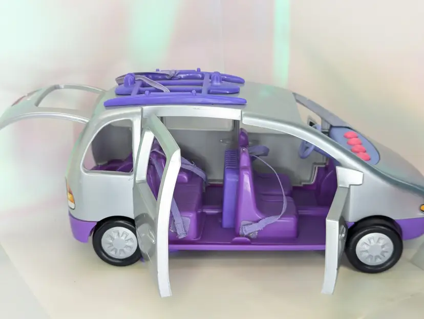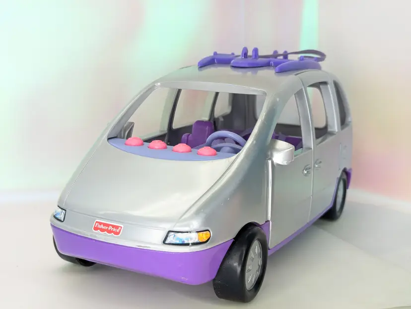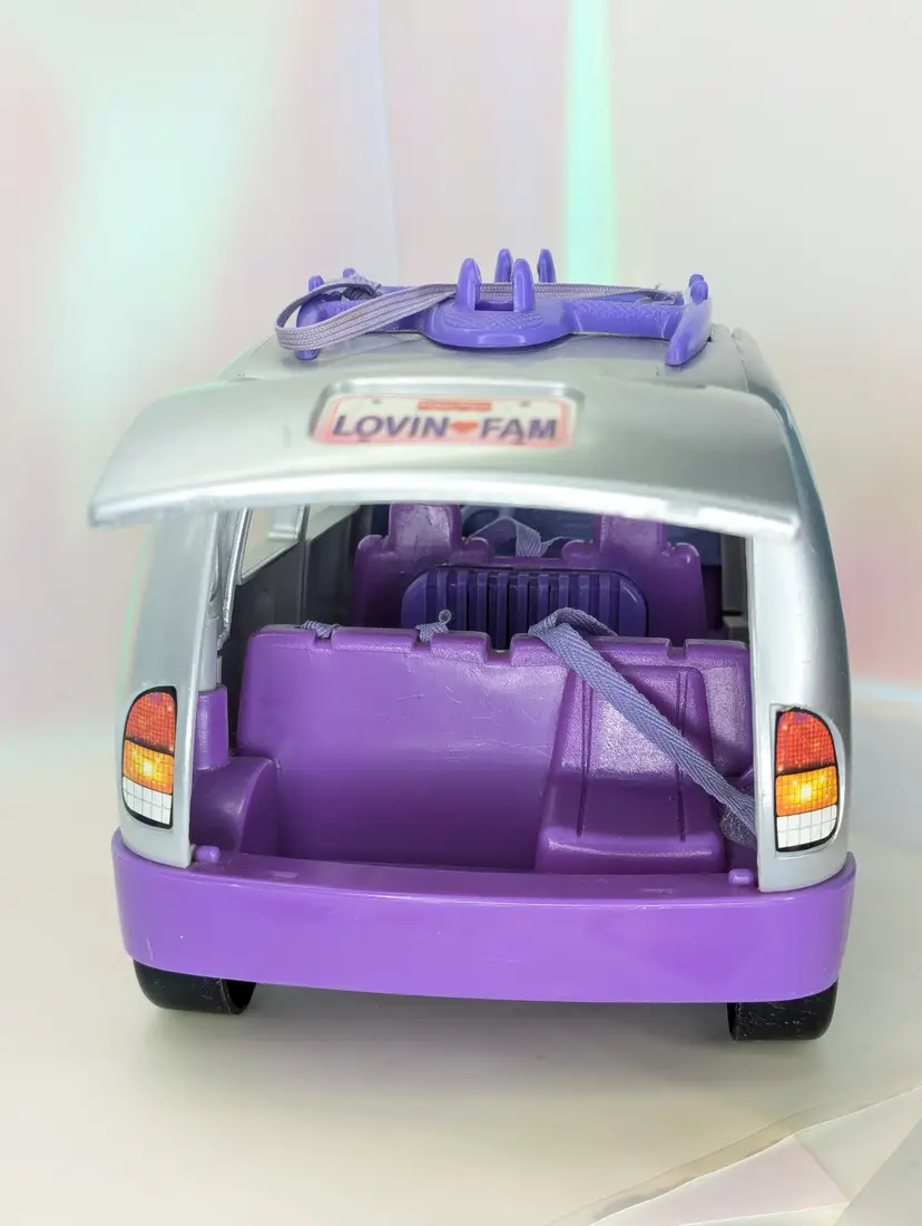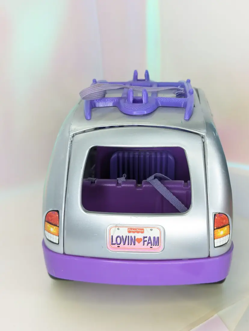 Vintage 1999-2001 Fisher Price Loving Family Fun Sounds Sports Van in Silver & Purple - NON-WORKING SOUND - Clean battery compartment, but for some reason it will not play sounds. Van is in good shape over all. No broken parts or pieces. Has some paint wear/runs/scuffs/marks - see all photos Seat belts are all accounted for and still hold/stick. Doors open and close as they should. Has bike rack on the roof. Comes from a smoke free, pet friendly home. Item has been lightly cleaned.