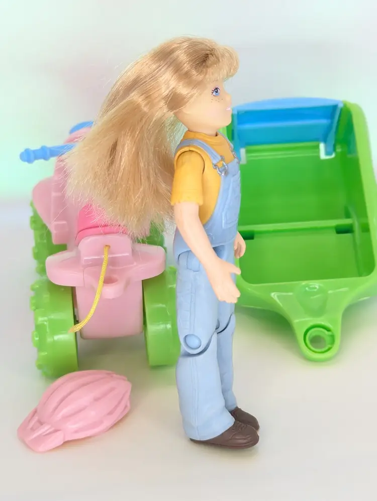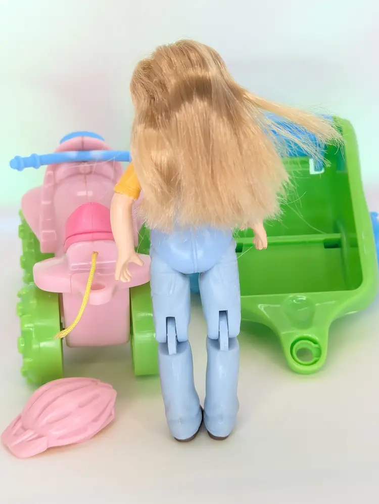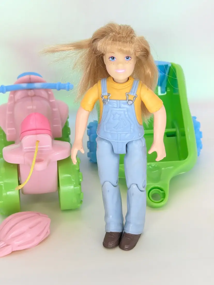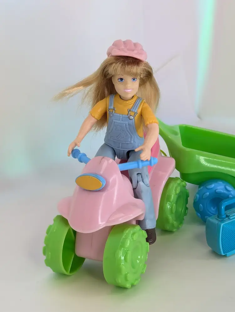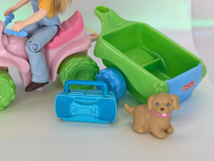 Fisher Price Loving Family Toys R Us exclusive 2008 ATV Fun Set - Including Campsite girl Doll with ATV 4 Wheeler, pull Wagon, radio & Pet Dog - Wagon is missing the peg that connects it into the ATV. The Helmet has also been cut from the ATV but is still included. Doll is in good have, no lose joints or broken parts. Holds a pose. Nice and clean hair. Pet dog is also in good shape. Items have light play wear./ marks/scuffs - See all photos - sold as shown. Comes from a smoke free, pet friendly home.