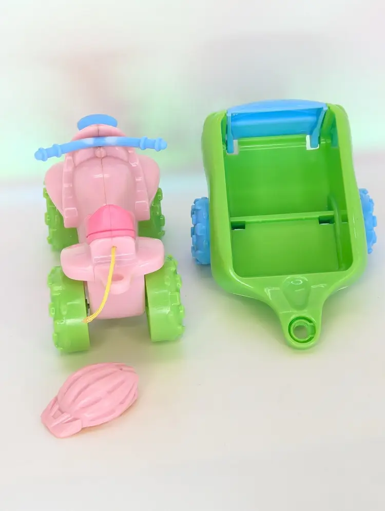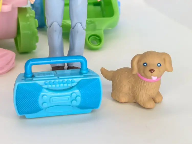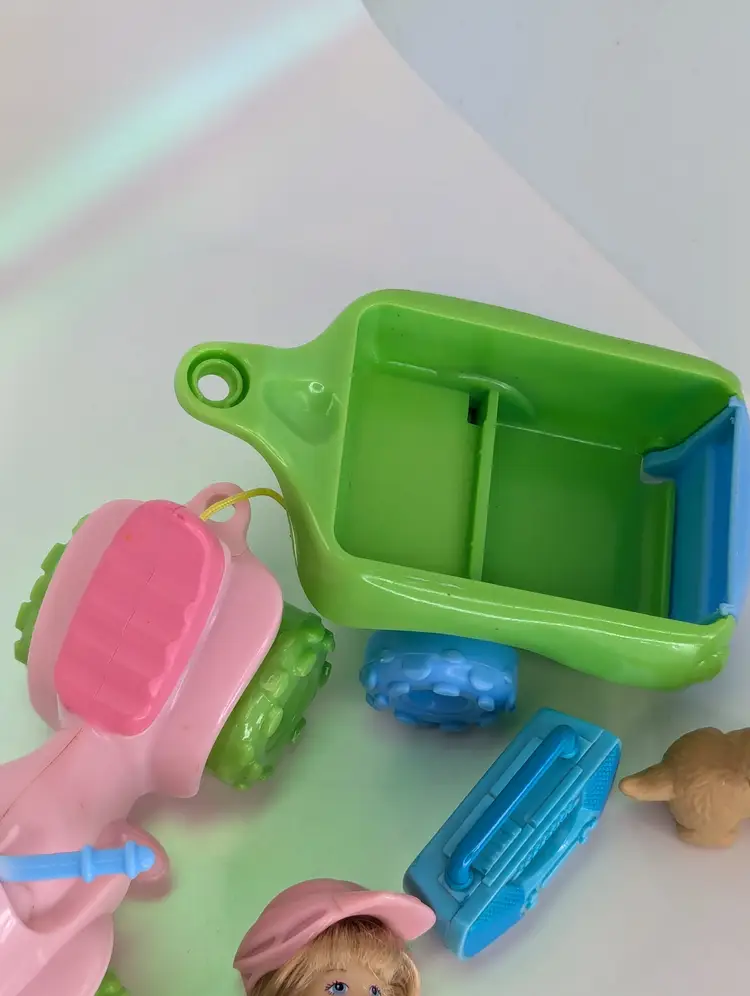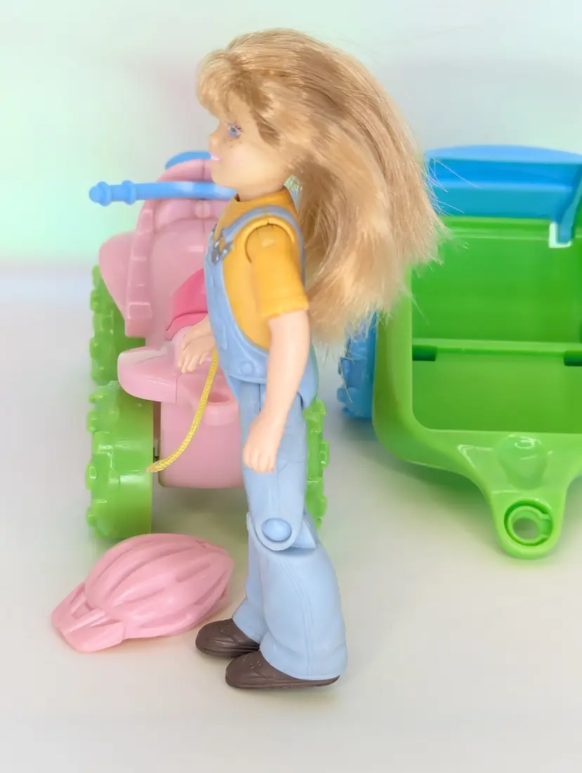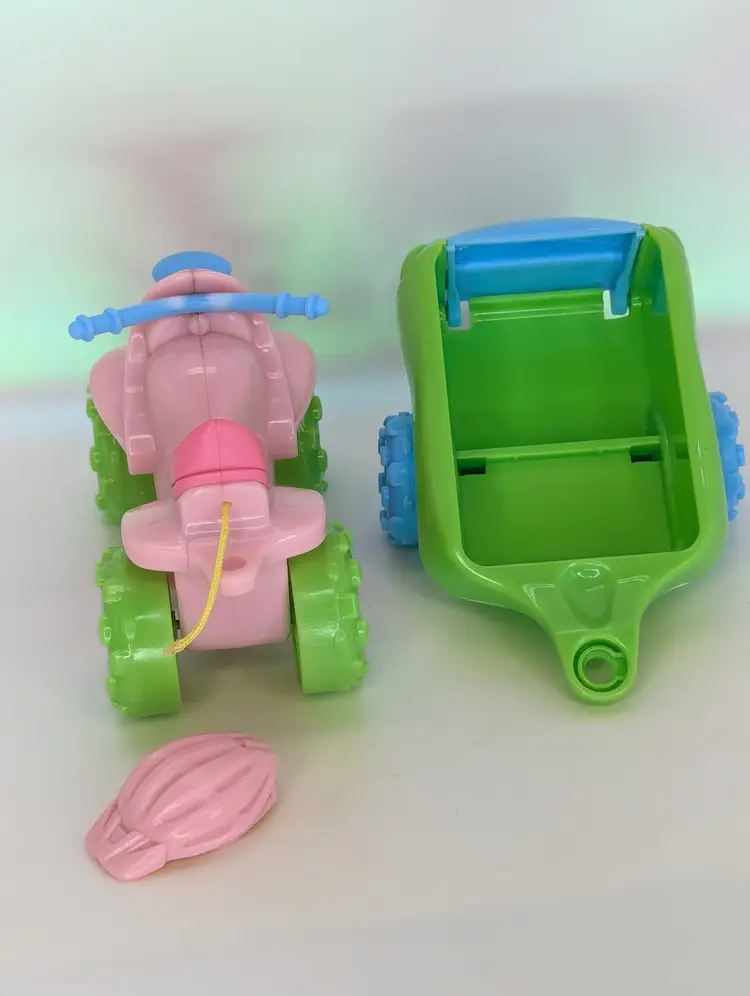 Fisher Price Loving Family Toys R Us exclusive 2008 ATV Fun Set - Including Campsite girl Doll with ATV 4 Wheeler, pull Wagon, radio & Pet Dog - Wagon is missing the peg that connects it into the ATV. The Helmet has also been cut from the ATV but is still included. Doll is in good have, no lose joints or broken parts. Holds a pose. Nice and clean hair. Pet dog is also in good shape. Items have light play wear./ marks/scuffs - See all photos - sold as shown. Comes from a smoke free, pet friendly home.