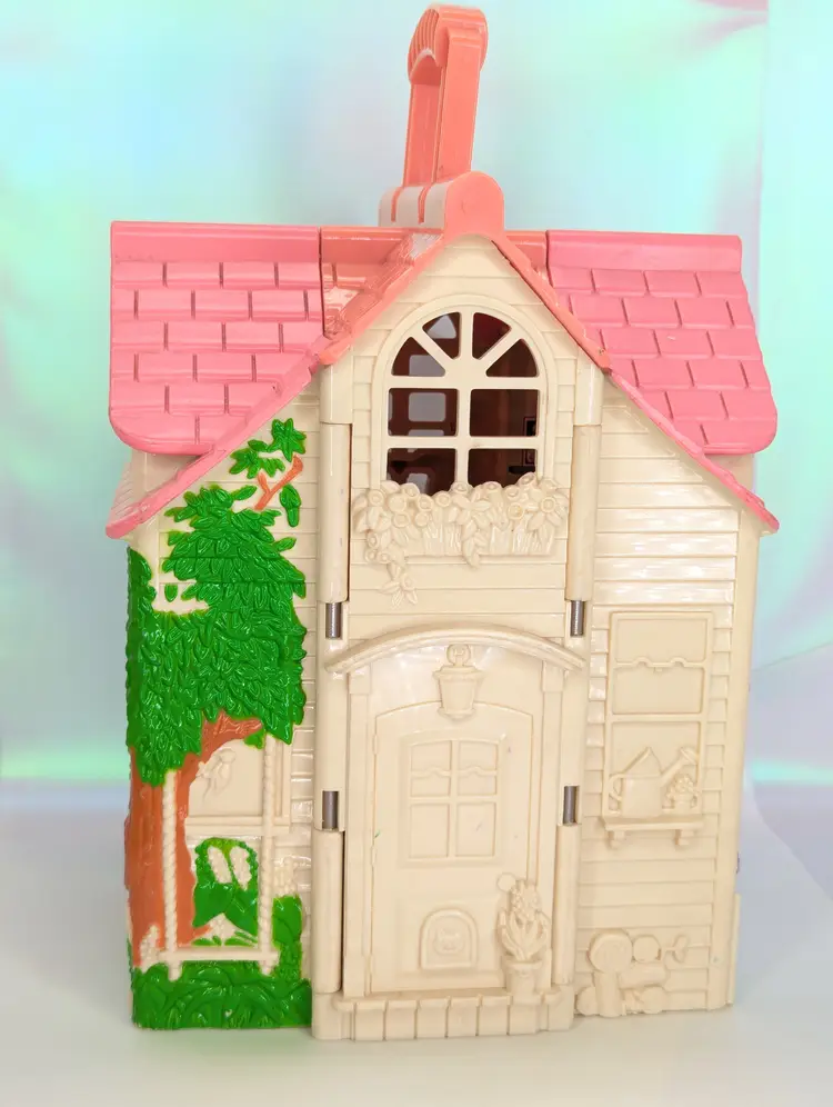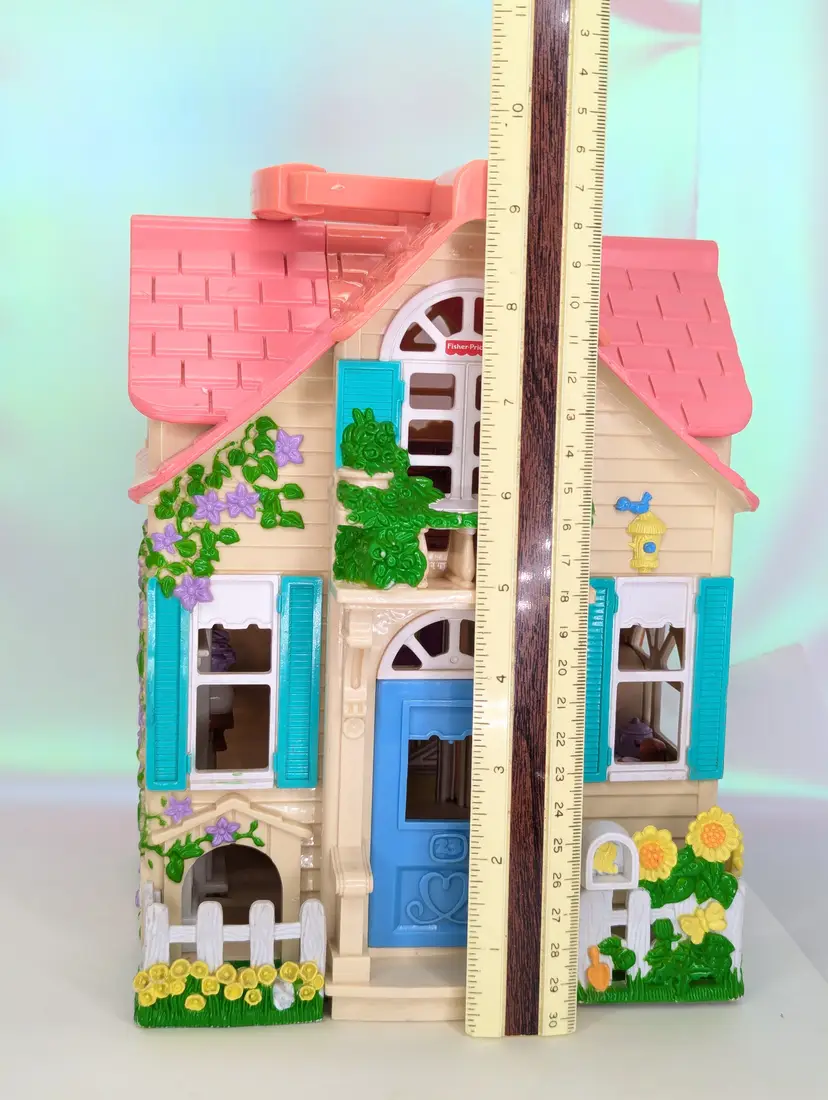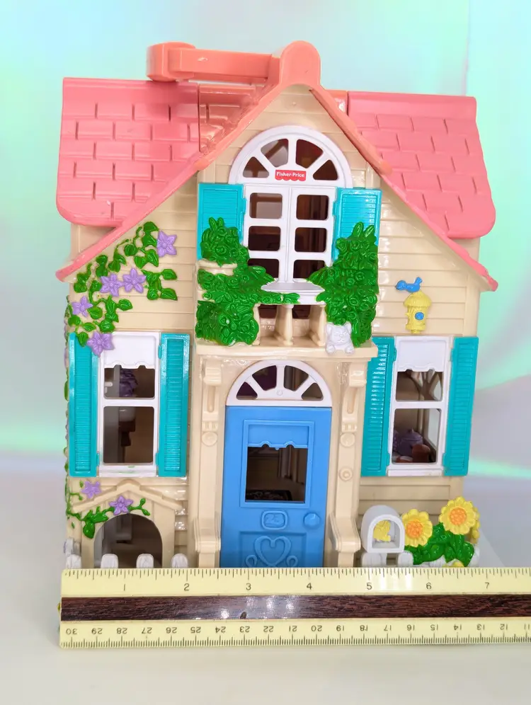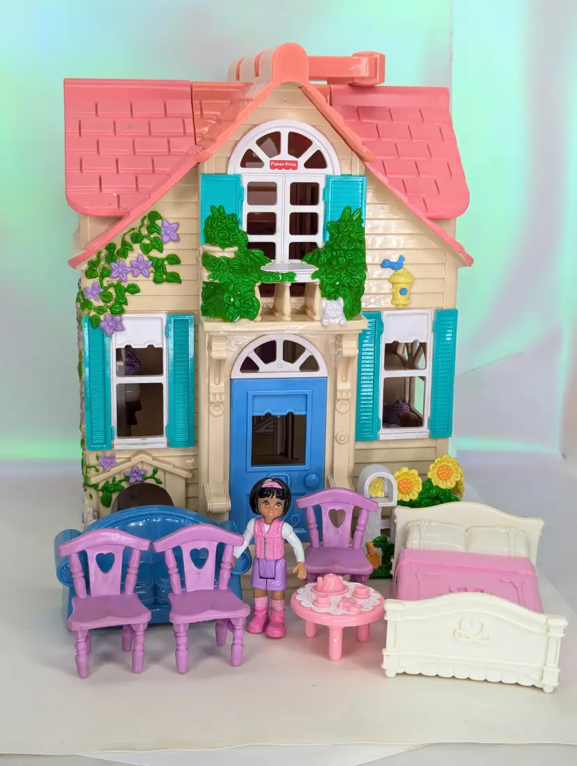 Vintage Fisher Price Sweet Streets Country Cottage Home Dollhouse with some furniture from 2000. Comes with e original furniture pieces including the Couch, Bed, 3 chairs, and pink baby table(not original to this house). I have also included one little girl figure with this set. This dollhouse is in good condition. But It has sticker wear/water damage on the top floor to the wall stickers. That sticker has also unstuck and is curved a bit. There is also light fade/wear to the rug sticker in that room. The rest of the house stickers/walls/rugs are in good shape! The plastic does have some marks and scuffs. See all photos. This is still a beautiful doll house that just needs some love! This dollhouse has a blue door and pink handle to carry the house with you wherever you go! Opens and closes as it should. No broken parts or pieces. Measures 7" X 6" X 10.5" High Comes from a smoke free, pet friendly home. Item has been lightly cleaned and stored away