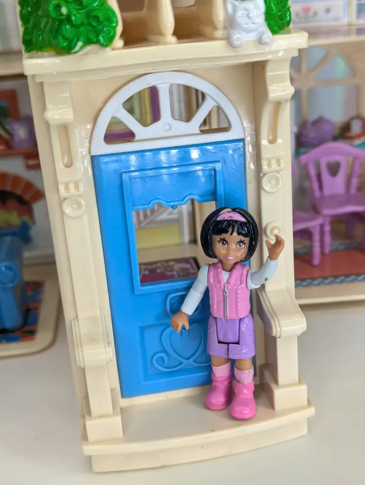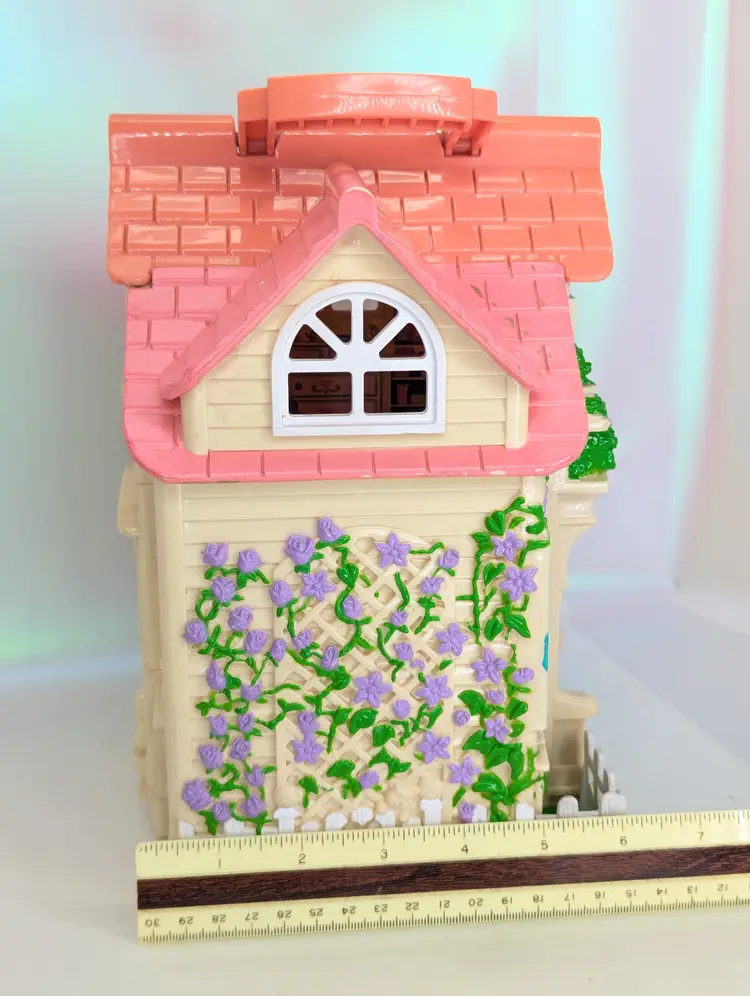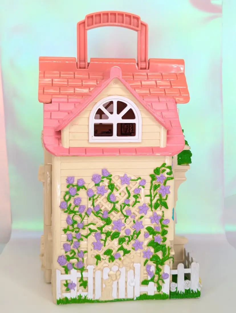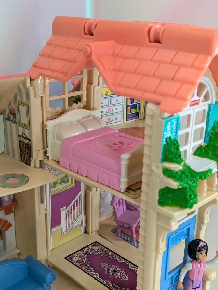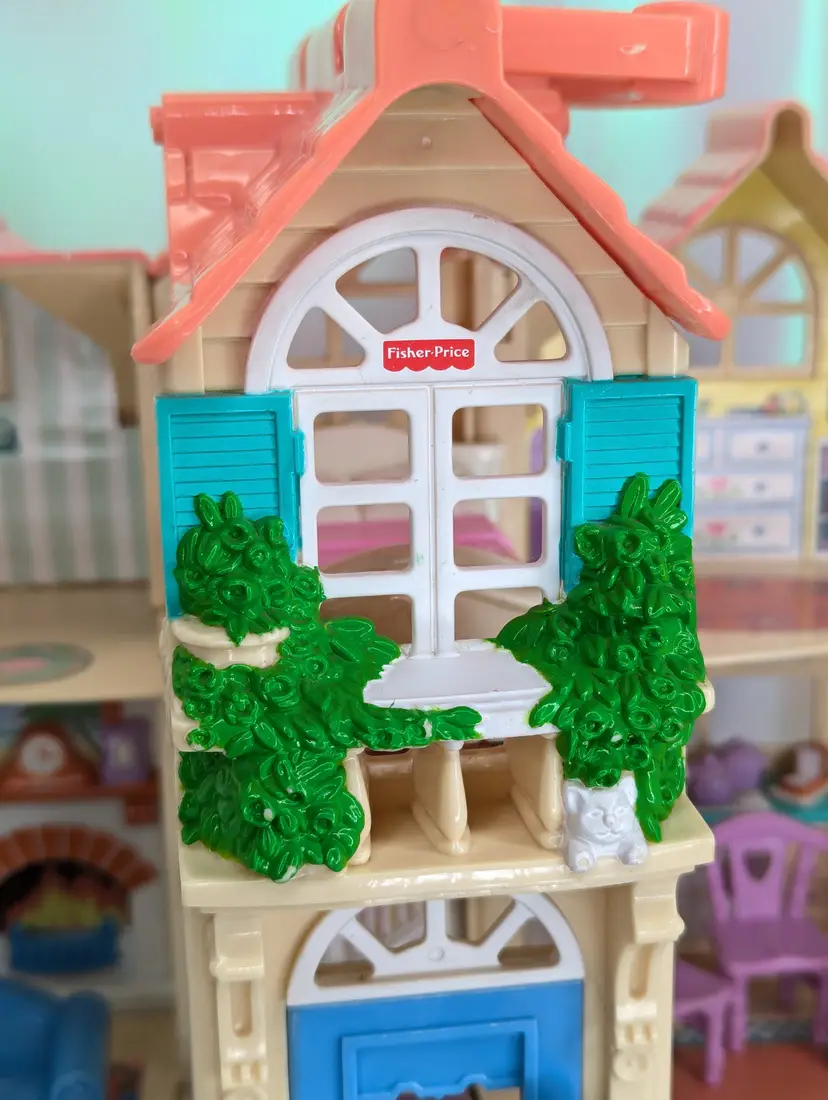 Vintage Fisher Price Sweet Streets Country Cottage Home Dollhouse with some furniture from 2000. Comes with e original furniture pieces including the Couch, Bed, 3 chairs, and pink baby table(not original to this house). I have also included one little girl figure with this set. This dollhouse is in good condition. But It has sticker wear/water damage on the top floor to the wall stickers. That sticker has also unstuck and is curved a bit. There is also light fade/wear to the rug sticker in that room. The rest of the house stickers/walls/rugs are in good shape! The plastic does have some marks and scuffs. See all photos. This is still a beautiful doll house that just needs some love! This dollhouse has a blue door and pink handle to carry the house with you wherever you go! Opens and closes as it should. No broken parts or pieces. Measures 7" X 6" X 10.5" High Comes from a smoke free, pet friendly home. Item has been lightly cleaned and stored away
