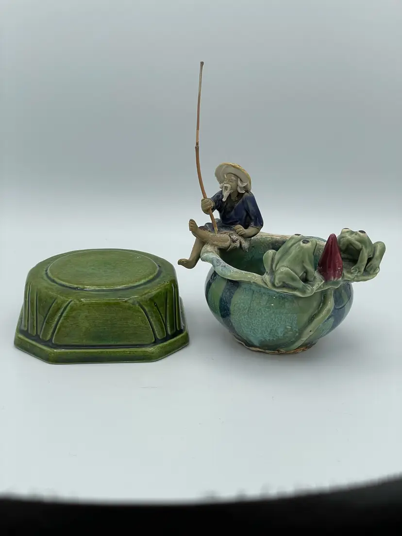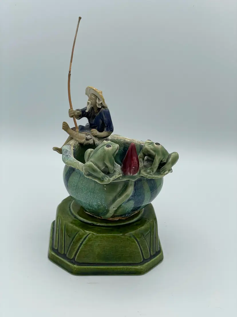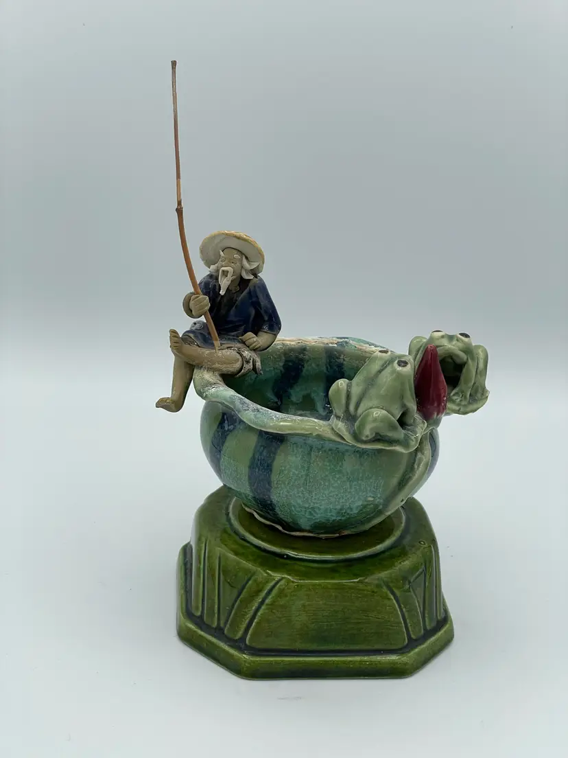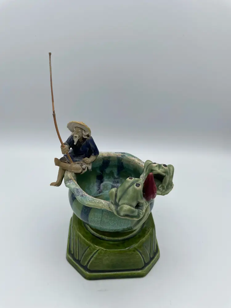 Vintage Chinese Oriental Fisherman's Fortune Planter Pot/Trinket Dish And Frogs. Glazed Pottery. 3 3/4" Tall X 4 1/2" W. No Chips/Cracks.