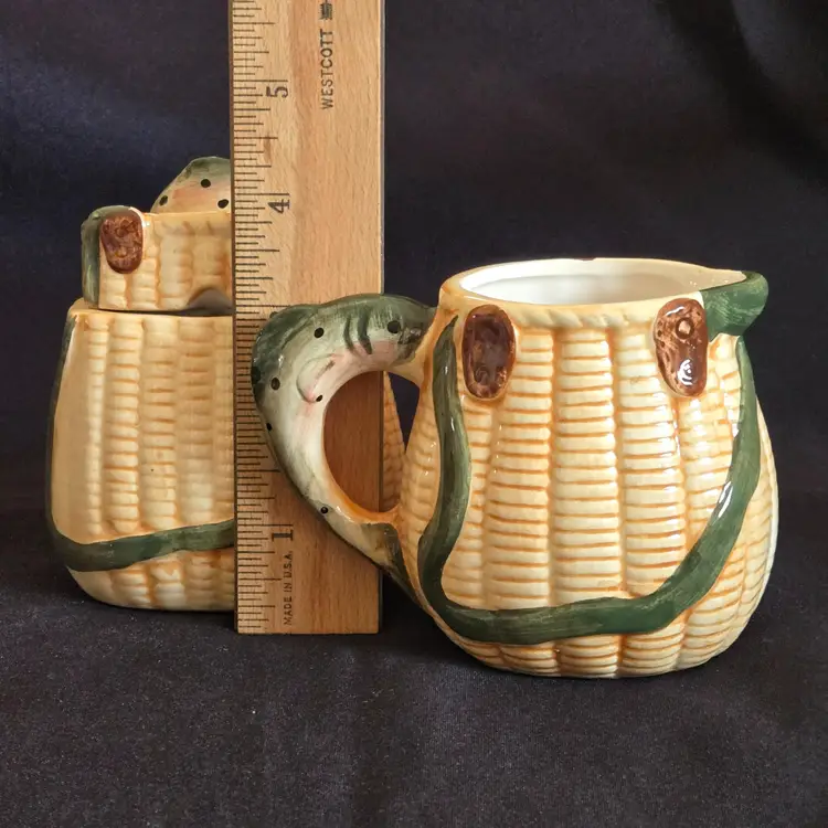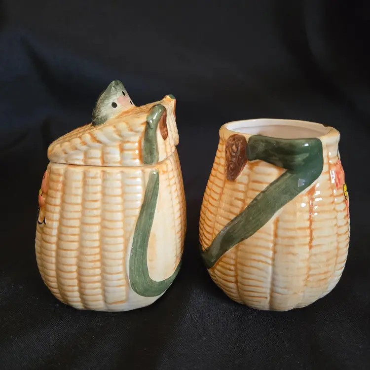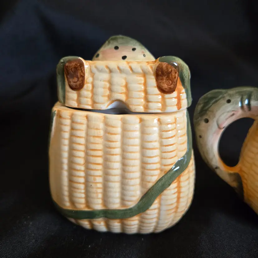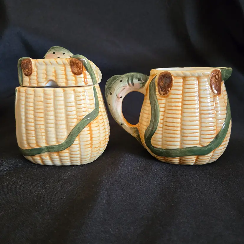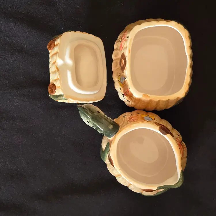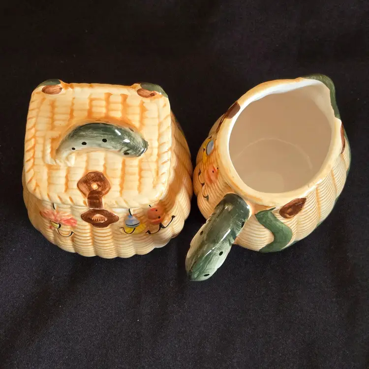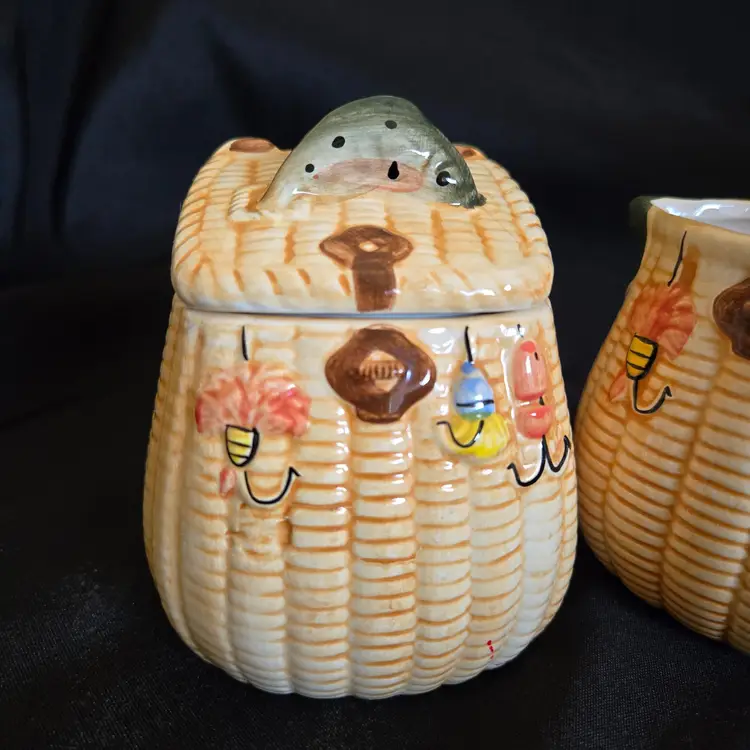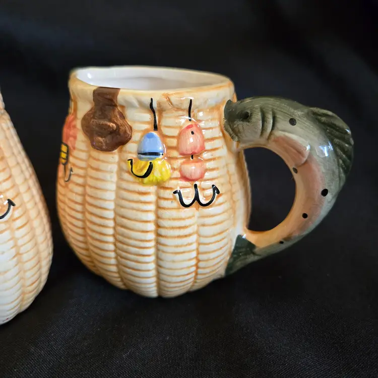 Fishing Creel Rainbow Trout Sugar Bowl and Creamer Ceramic made in Taiwan. Used condition with some dirt and stains from minimal use along with manufacturer flaws including dirt and extra color in places within the glaze. Please view all the photos and read this entire item description and please ask any questions prior to purchase when possible.