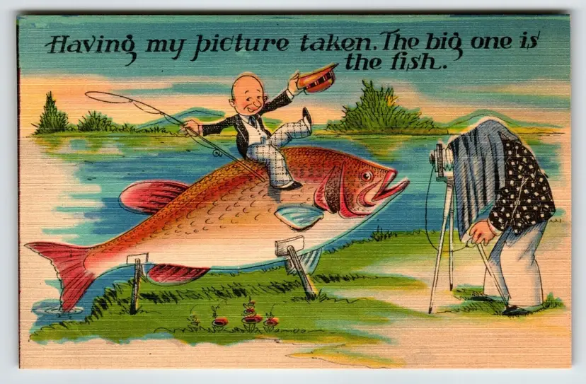 Artist: Unknown Unit of Sale: Single Unit Number of Items in Set: 1 Signed By: Unk Occasion: Any Signed: No Year Manufactured: 1940 Material: Paper Original/Licensed Reprint: Original Brand/Publisher: Asheville Post Card Subject: Fishing Personalize: No Type: Linen Postcard Era: Linen (1930-1945) Theme: Camera, Comical, Exaggerated, Fish, Fishing Poles, Giant Fish, Humor, Hunting & Fishing Features: Divided Back Country/Region of Manufacture: United States Postage Condition: Unposted