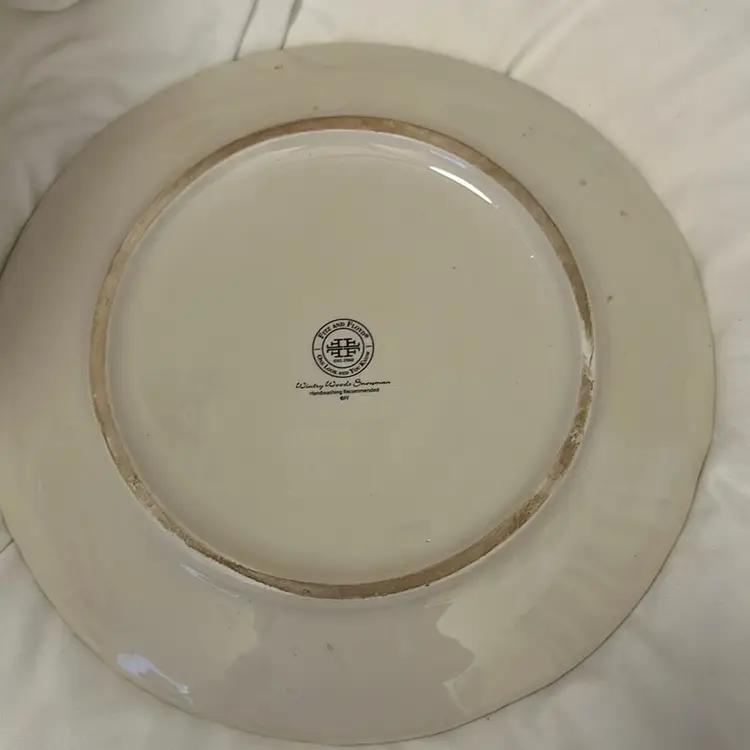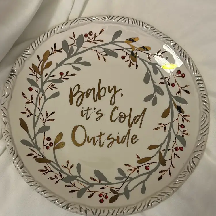 This round plate by Fitz And Floyd is recommends handwashing only. The design of cranberry and leaves surrounds the saying in the center. It is used, great condition, no chips visible or felt! This measures 10” across!