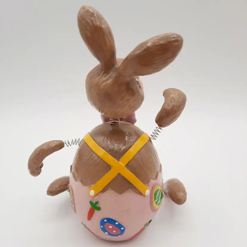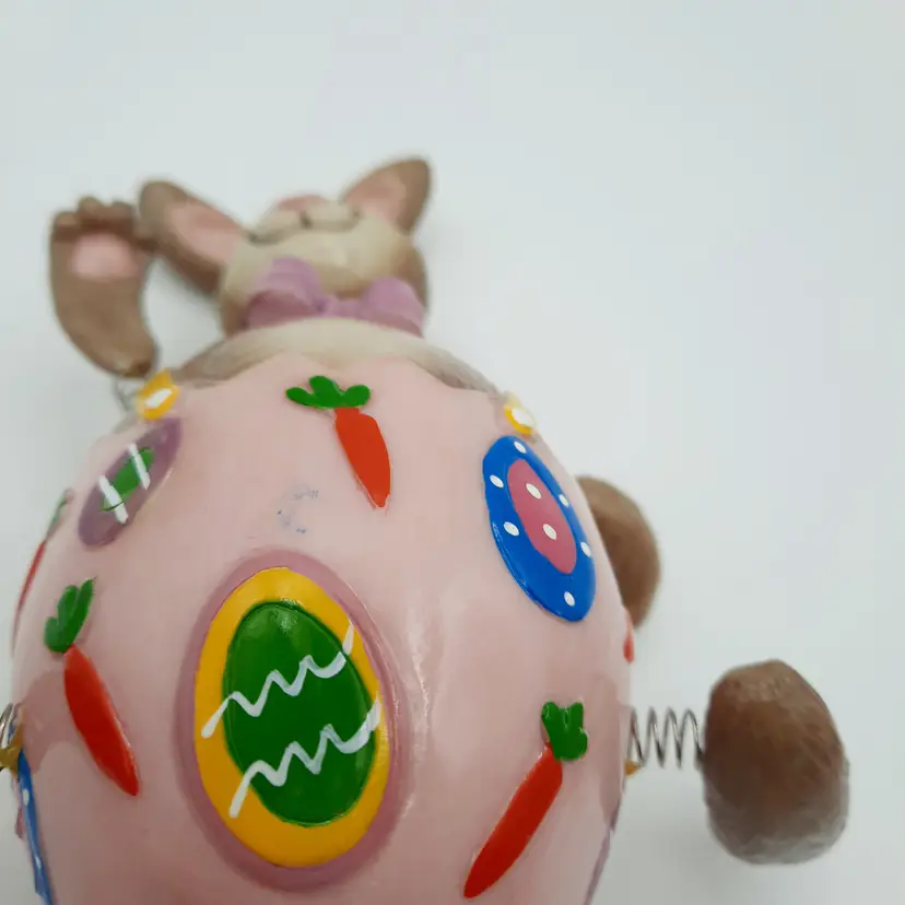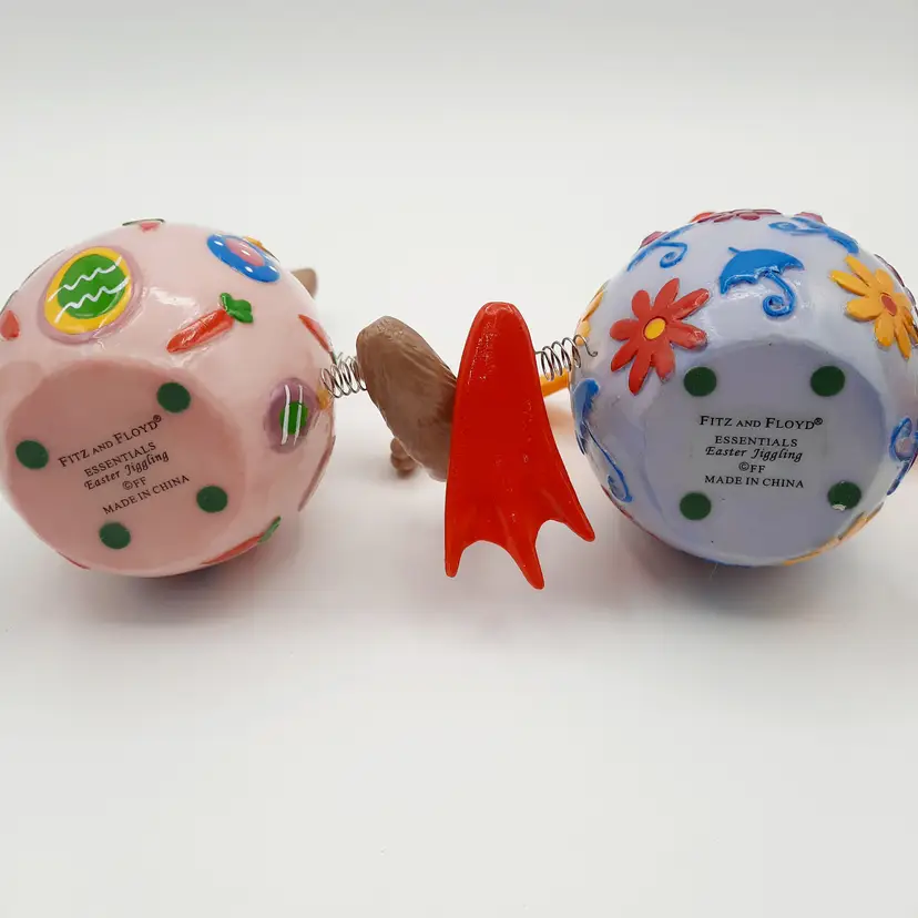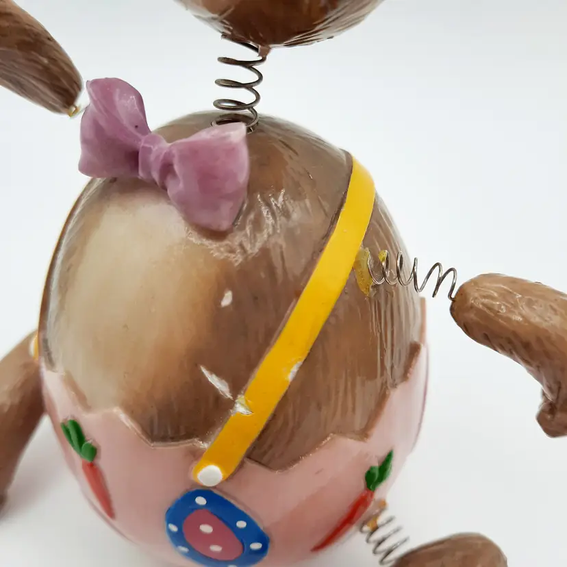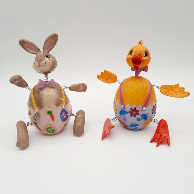 These fun fellas are approximately 5"H x 2"W, chick is in great condition, bunny has some chips and scrapes on his upper half and bowtie, some excess paint in the pink and some glue residue on springs