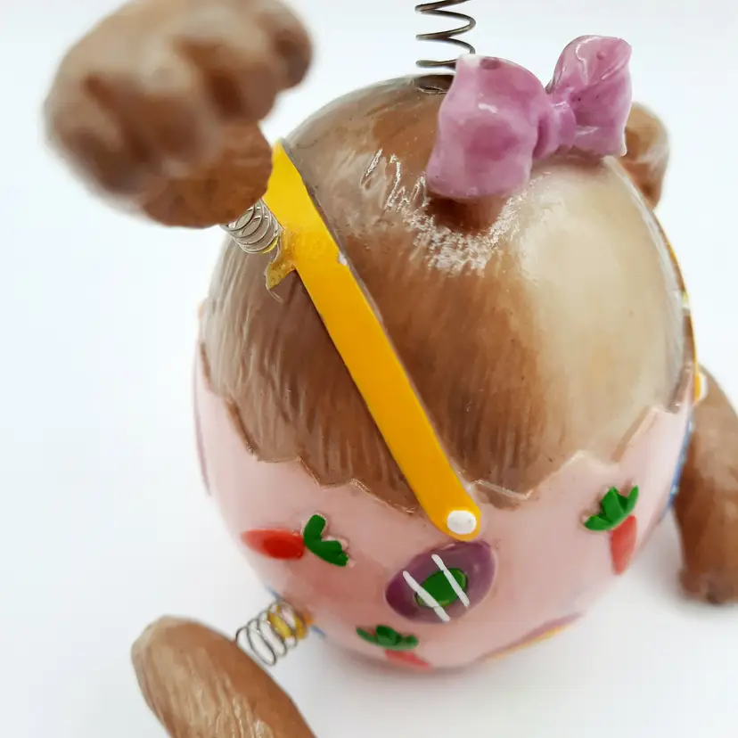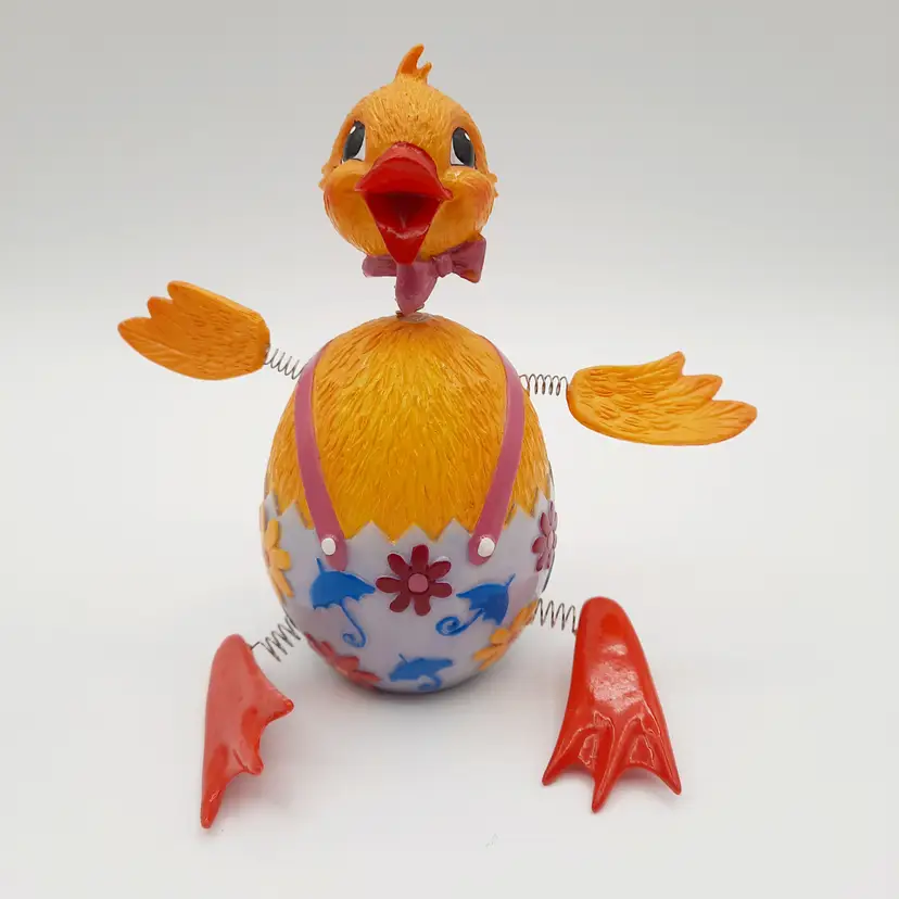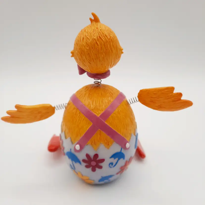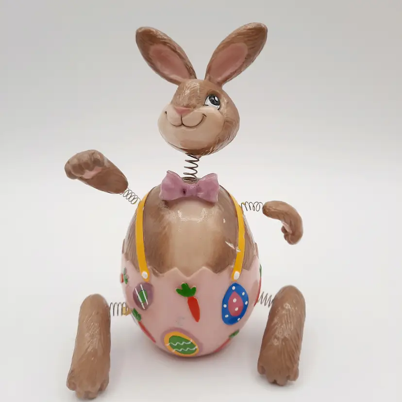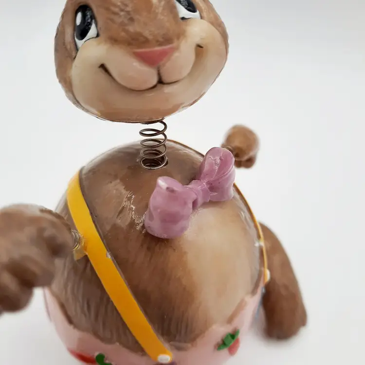 These fun fellas are approximately 5"H x 2"W, chick is in great condition, bunny has some chips and scrapes on his upper half and bowtie, some excess paint in the pink and some glue residue on springs