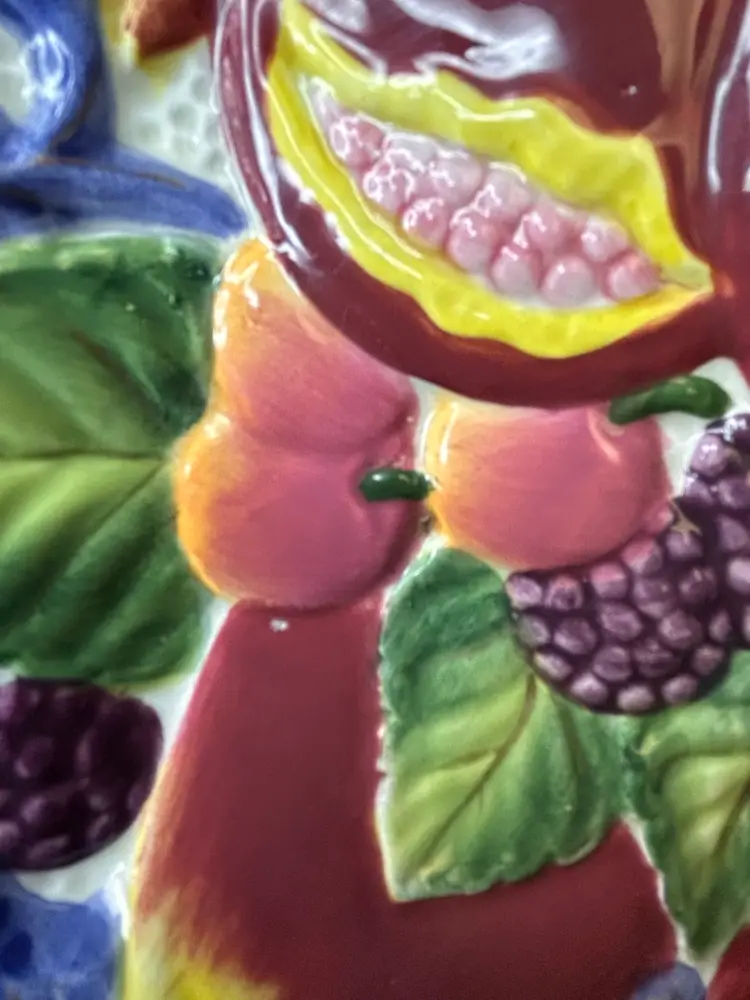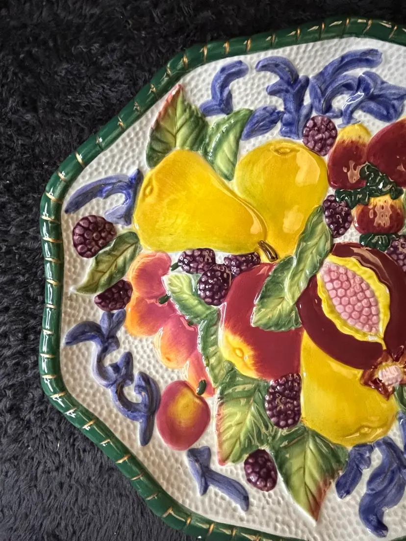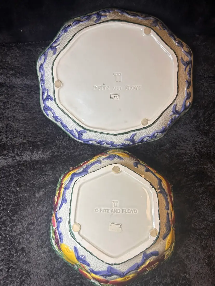 The Fitz & Floyd Florentine Fruits Ceramic Oval Vegetable Dish and Round Bowl set features a charming floral design in a vibrant multi-color palette. This decorative collectible set adds a touch of elegance to any dining table or collection. The oval vegetable dish and round bowl combination is versatile and perfect for serving a variety of fruits or vegetables.