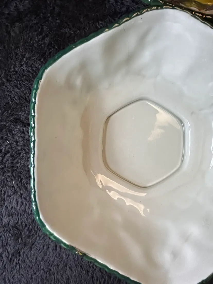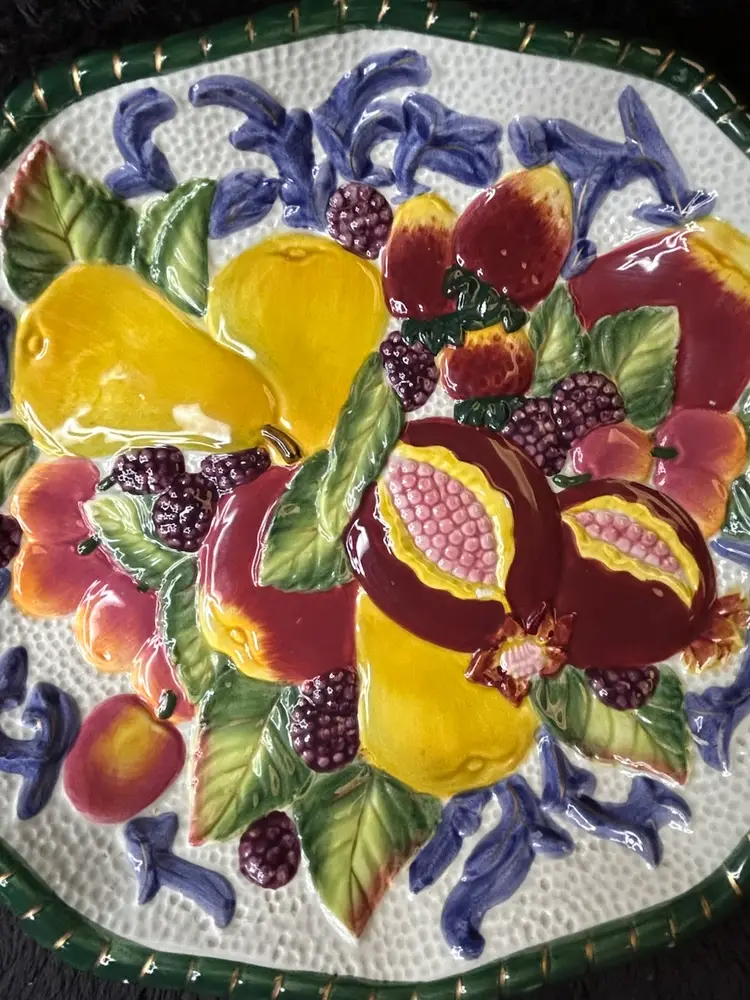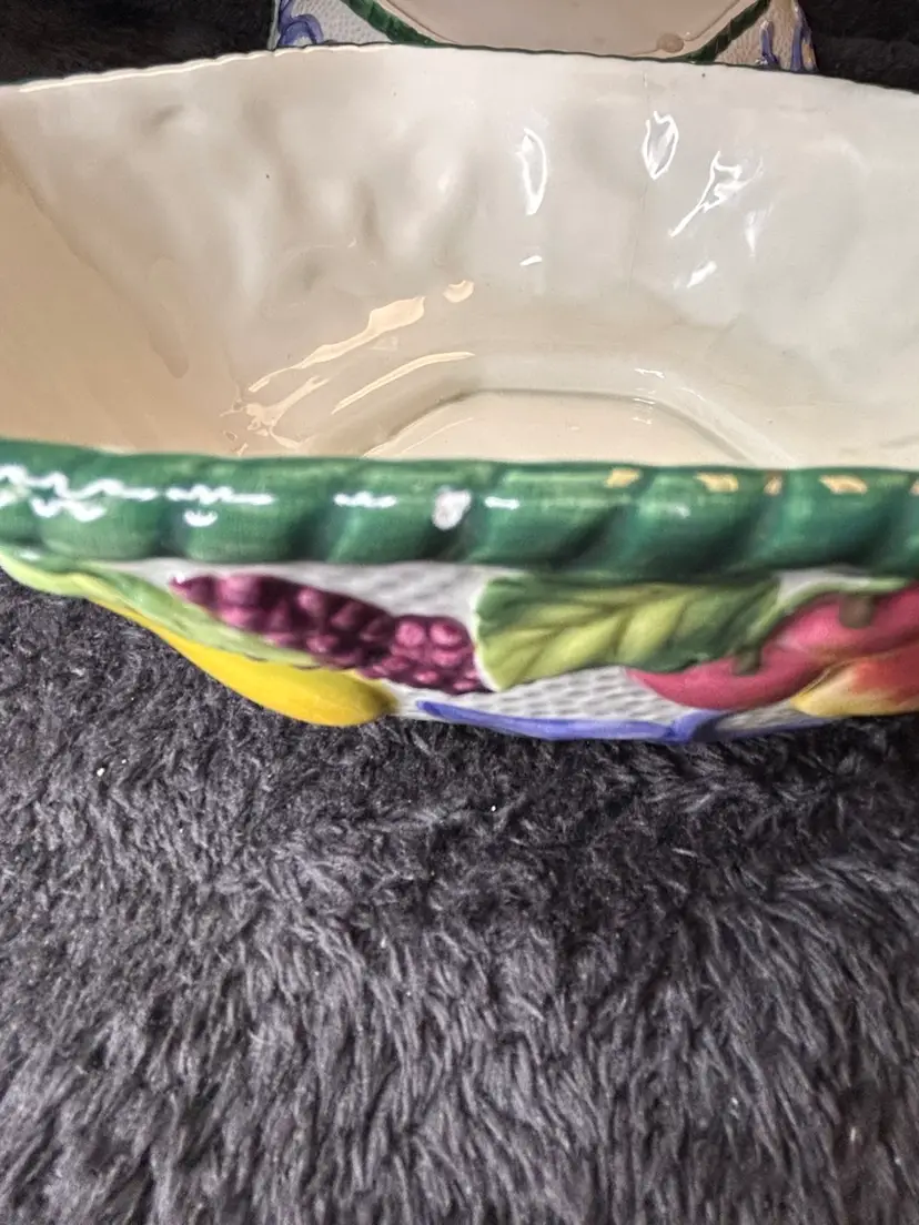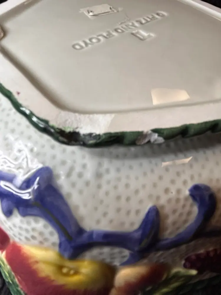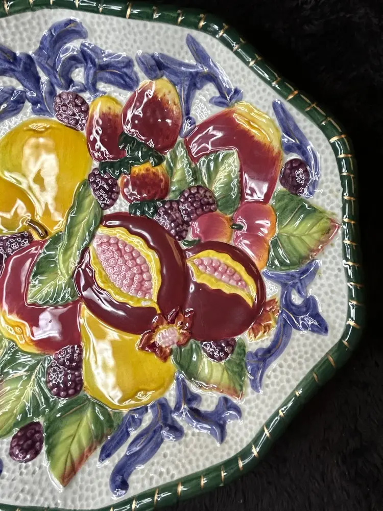 The Fitz & Floyd Florentine Fruits Ceramic Oval Vegetable Dish and Round Bowl set features a charming floral design in a vibrant multi-color palette. This decorative collectible set adds a touch of elegance to any dining table or collection. The oval vegetable dish and round bowl combination is versatile and perfect for serving a variety of fruits or vegetables.
