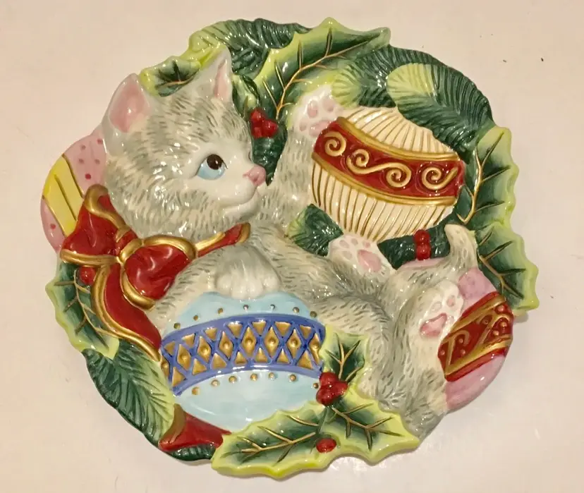 Adorable kitten Christmas wall hanger or cookie plate from Fitz and Floyd. Plate is raised, giving a 3D effect. Has holes built in for hanging.