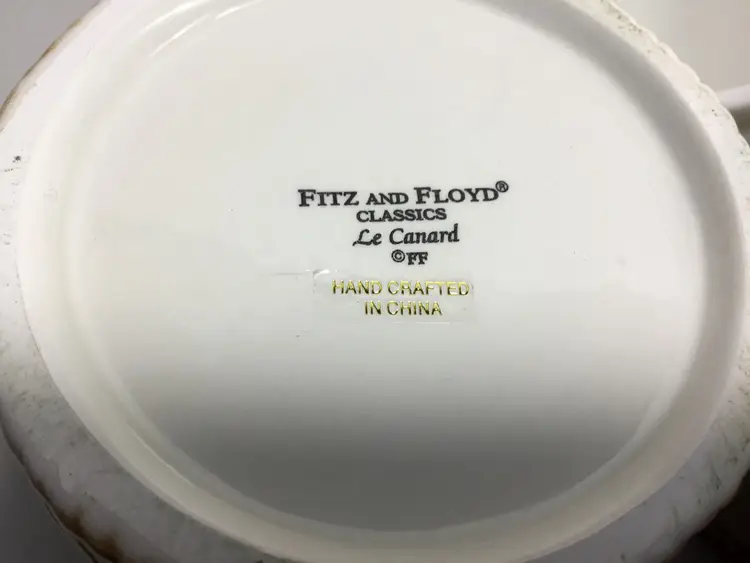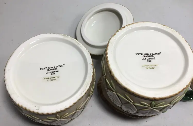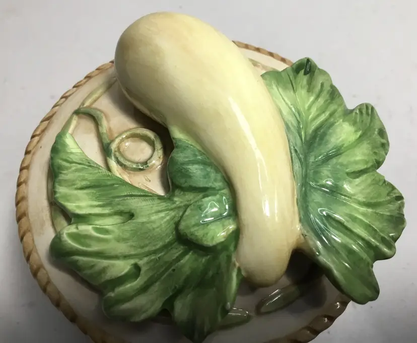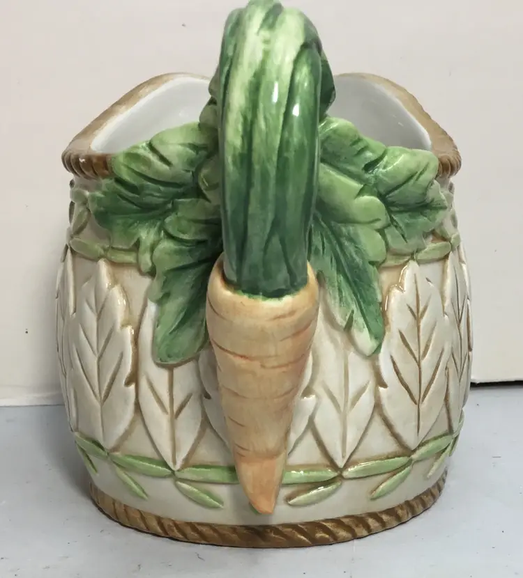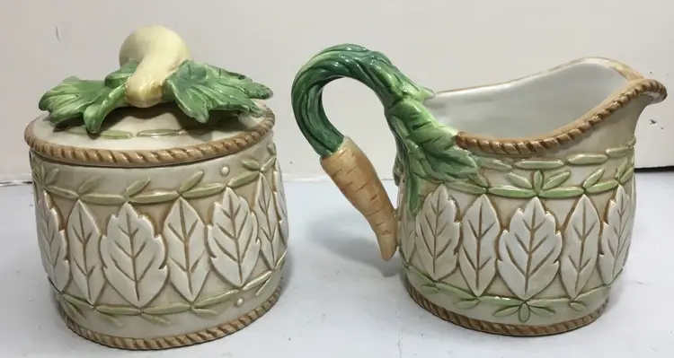 1 cup capacity for both creamer and sugar bowl. Both have beige glaze with darker beige rope-textured trim on rim and bottom edge. Both have relief leaves (boxelder leaves?) all around the body, in pale beige, with pale green trim fwith tiny leaves above and below larger leaves. Sugar bowl is 3.5 inches in diameter. Has yellow squash and green leaves for handle on the lid. Creamer is 3 inches diameter, 5.5 inches long from spout to outer handle. has carrot and leaves for a handle,