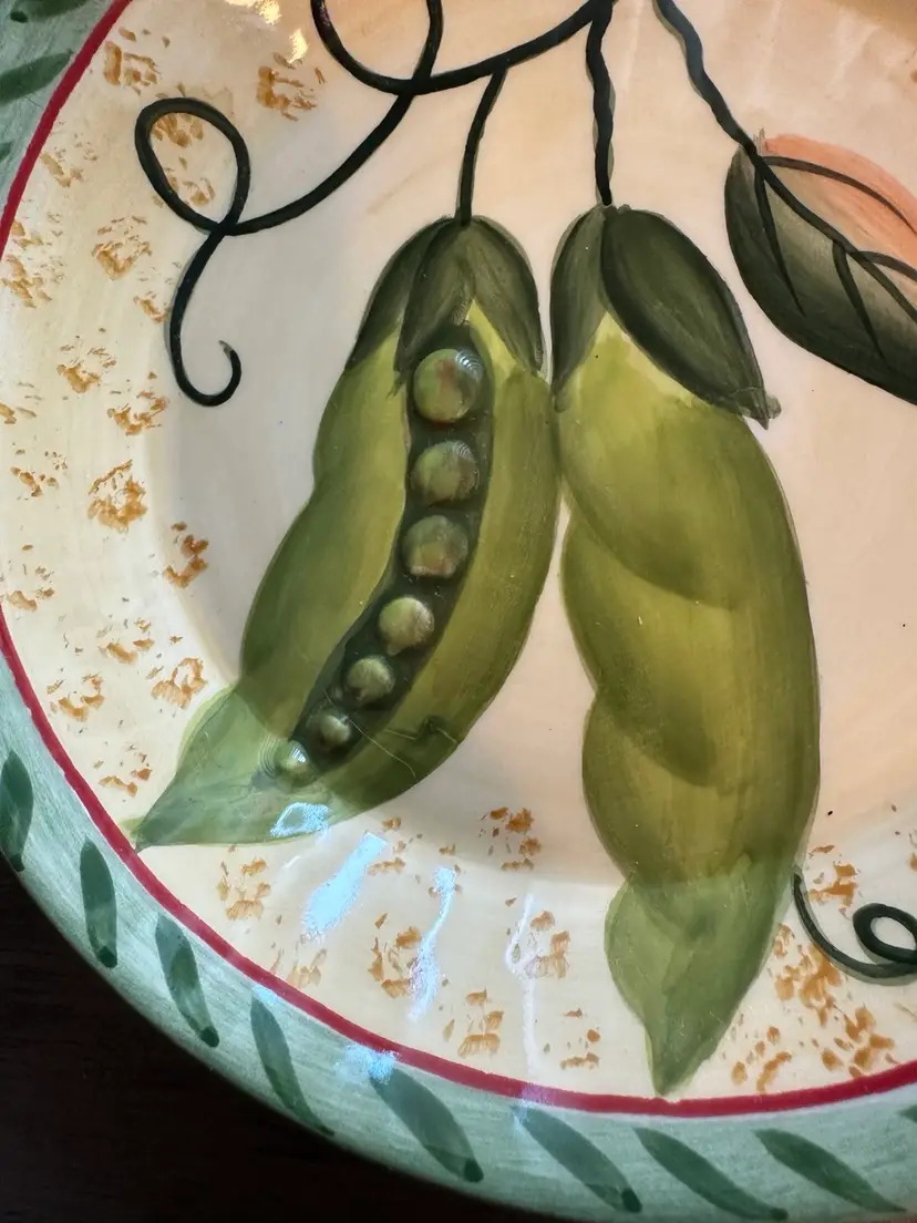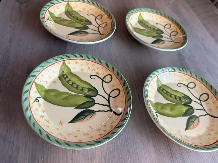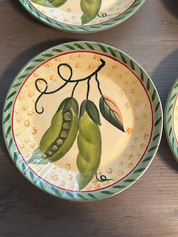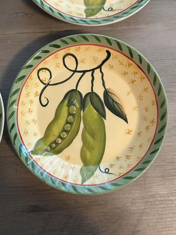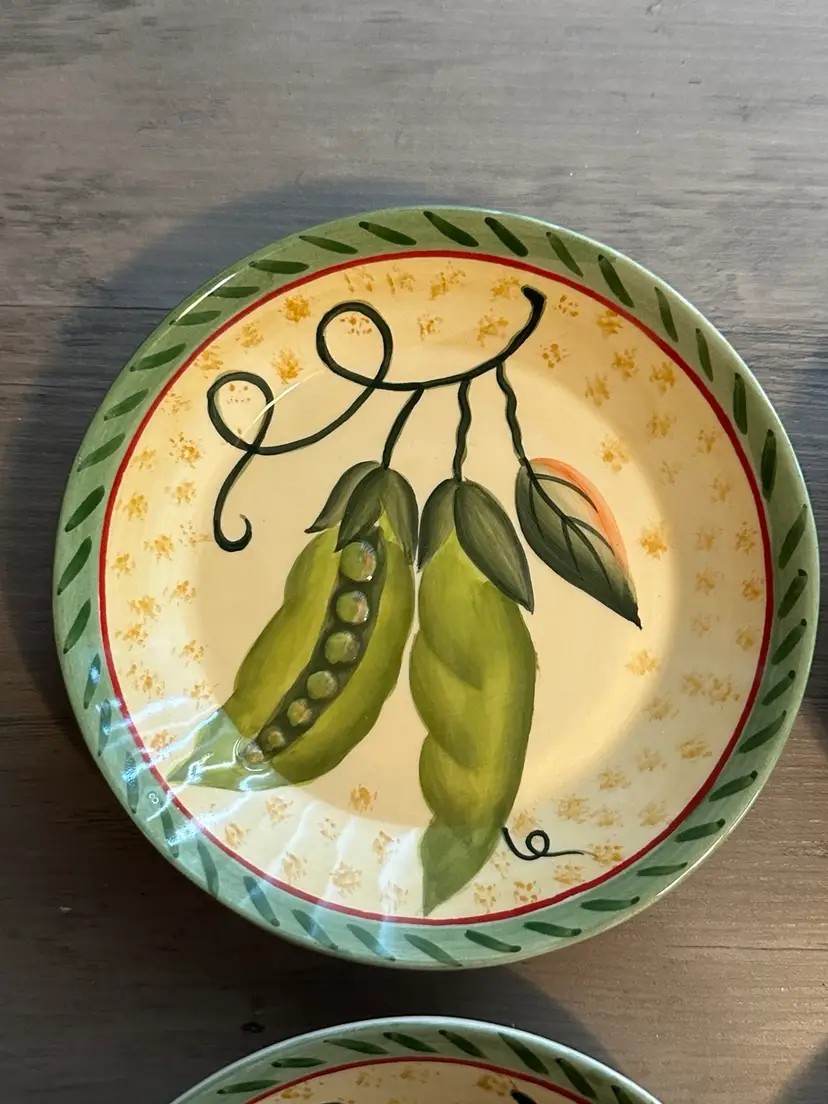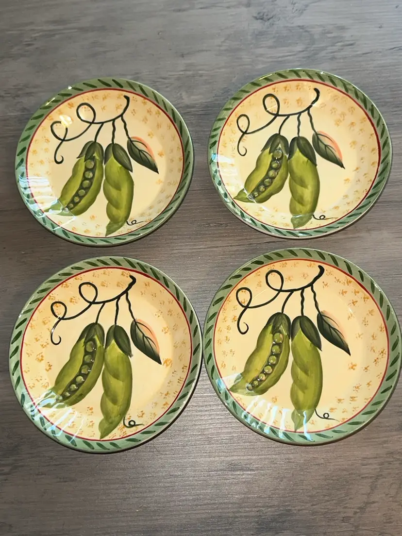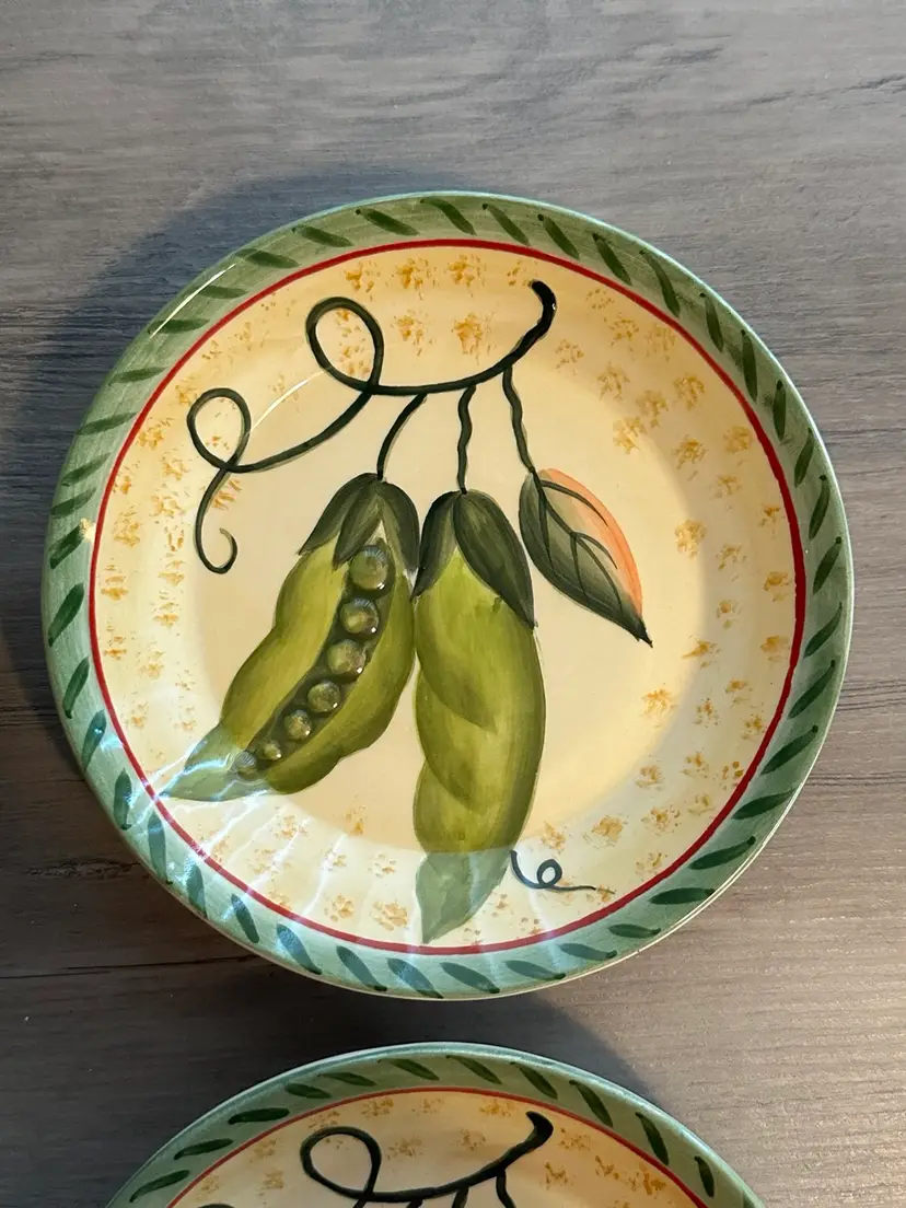 Fitz and Floyd Le Marche appetizer Plates set of 4. Like new, one plate on the peapod has what I believe is a manufactures mark/lines. ( see picture) It isn’t noticeable unless inspected closely. Approximately 5.25” diameter 5.3 oz each
