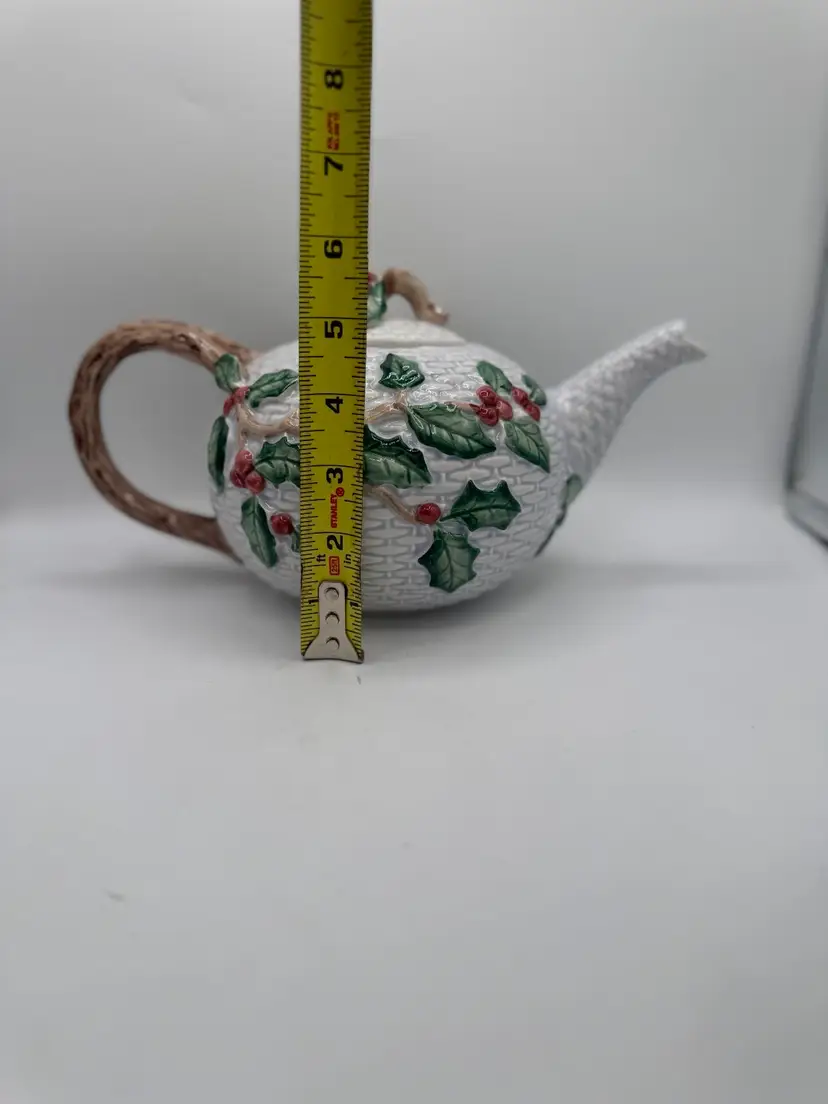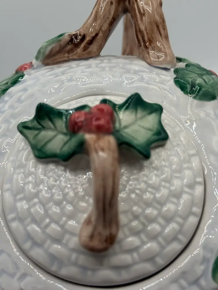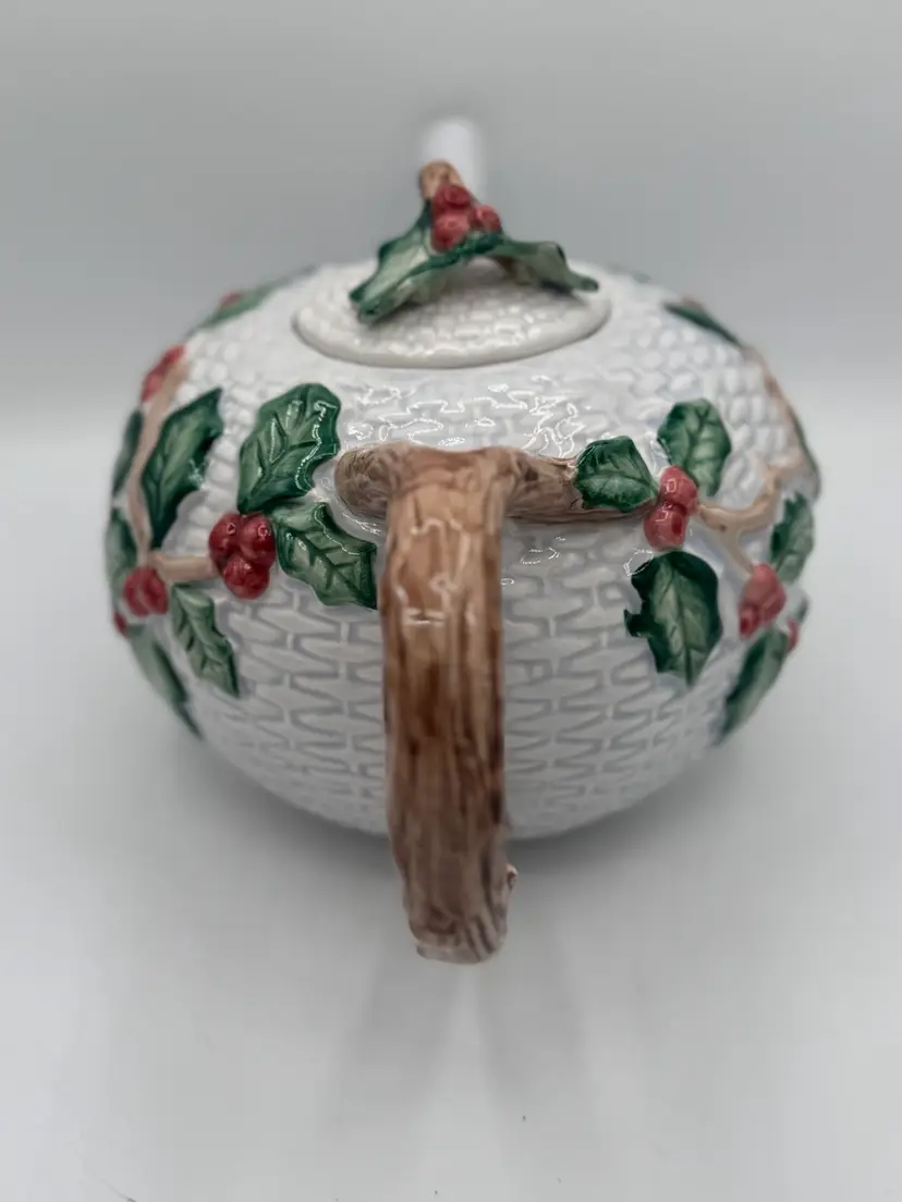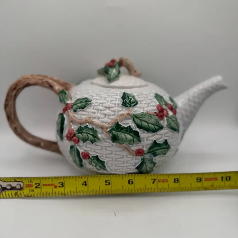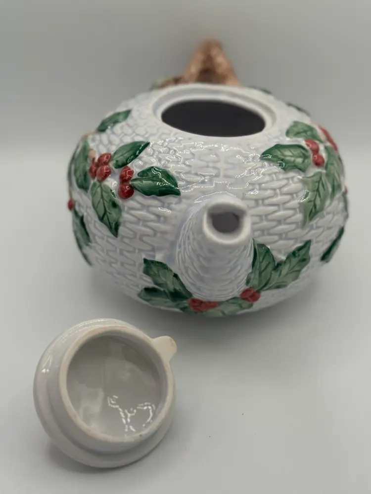 This pretty holiday teapot has a holy & berries pattern with a wood vine-look handle. It measures 5 1/2” in height and 10” wide. Made in the 1990’e.