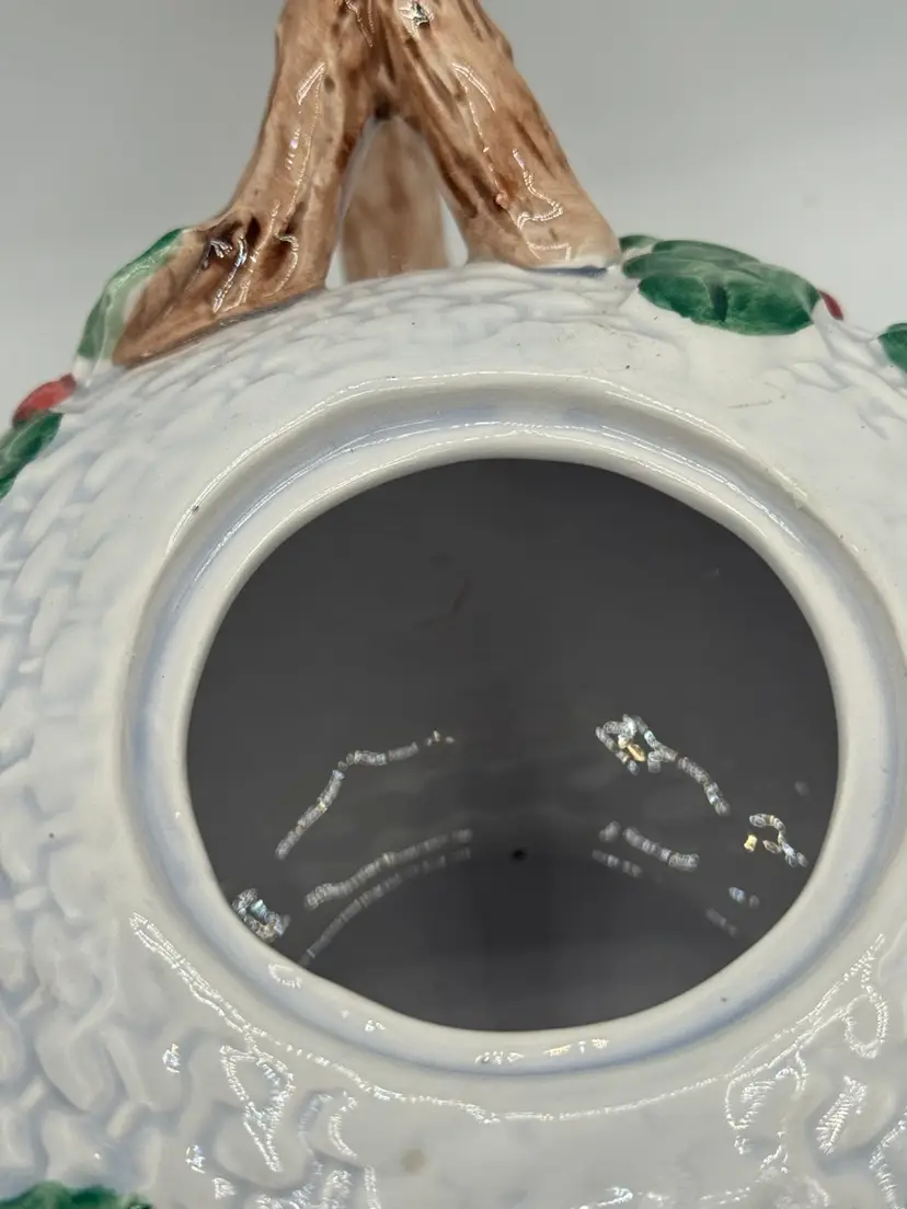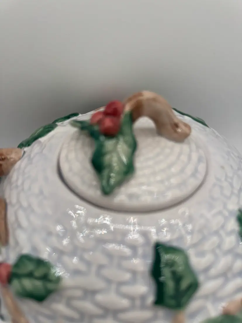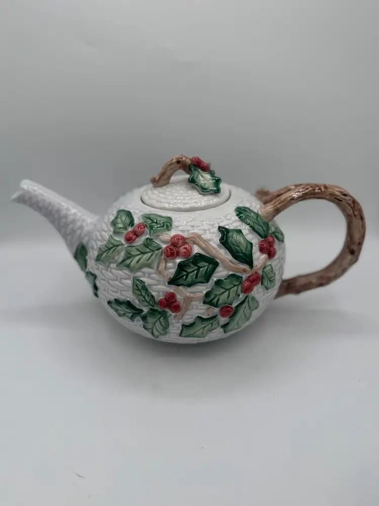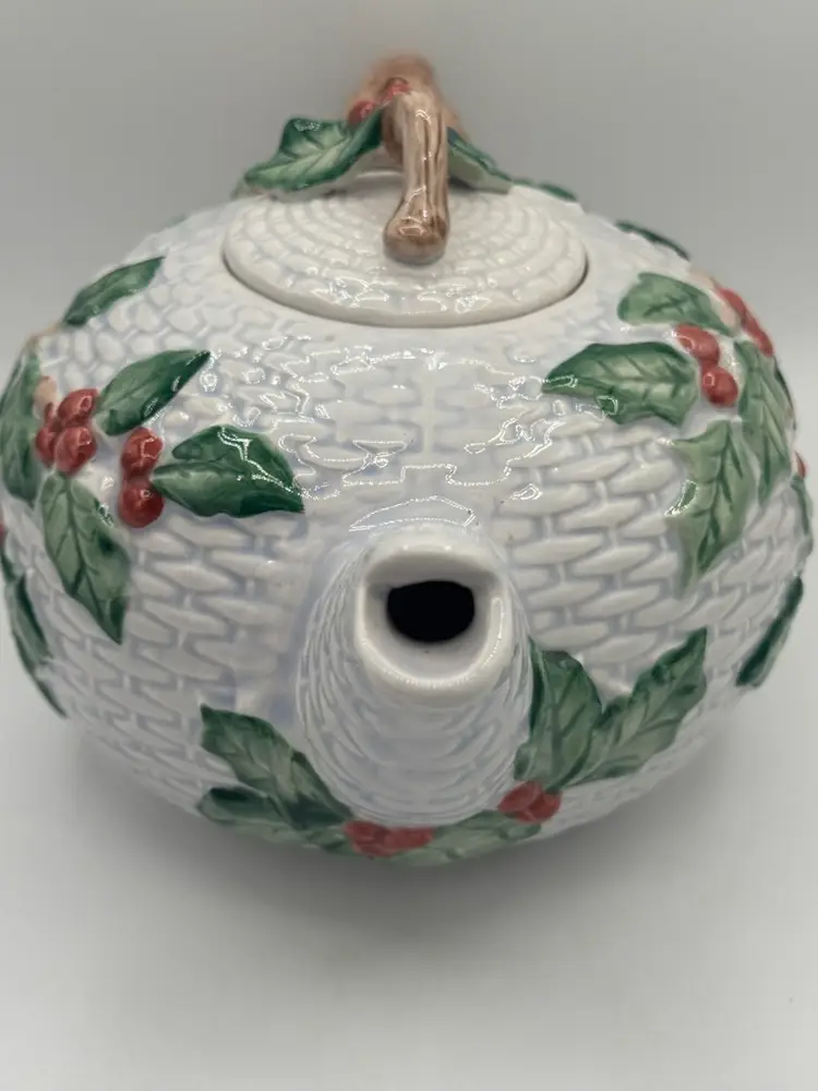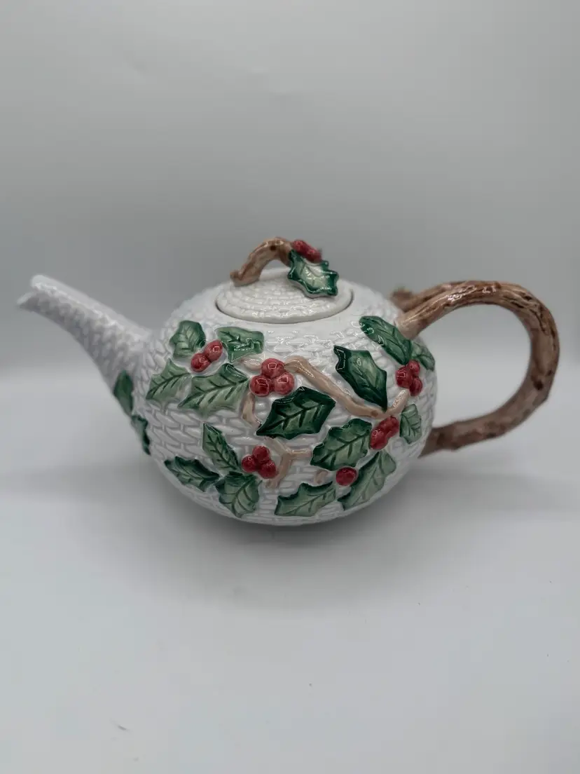 This pretty holiday teapot has a holy & berries pattern with a wood vine-look handle. It measures 5 1/2” in height and 10” wide. Made in the 1990’e.
