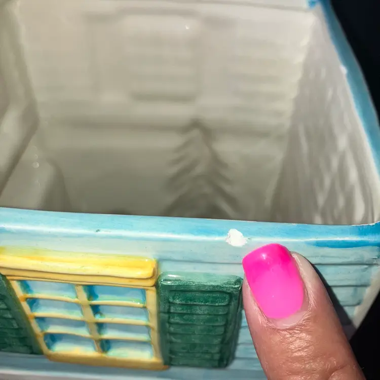 1 cup to the inside rim. And 5 superficial paint chips. Beautiful piece. 31 years old