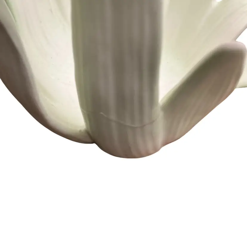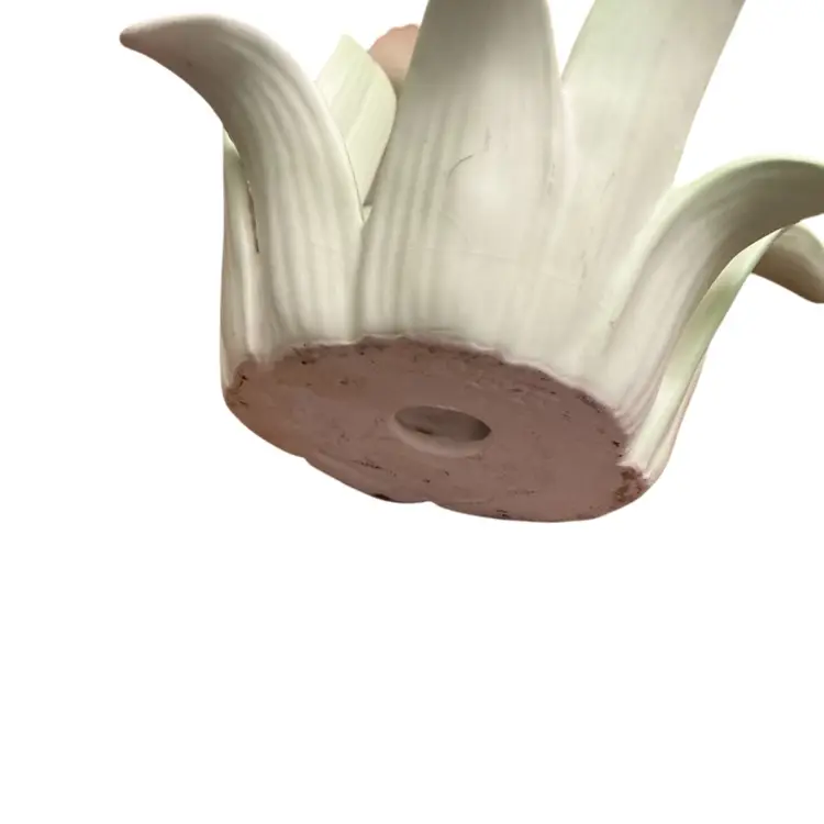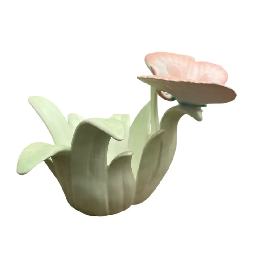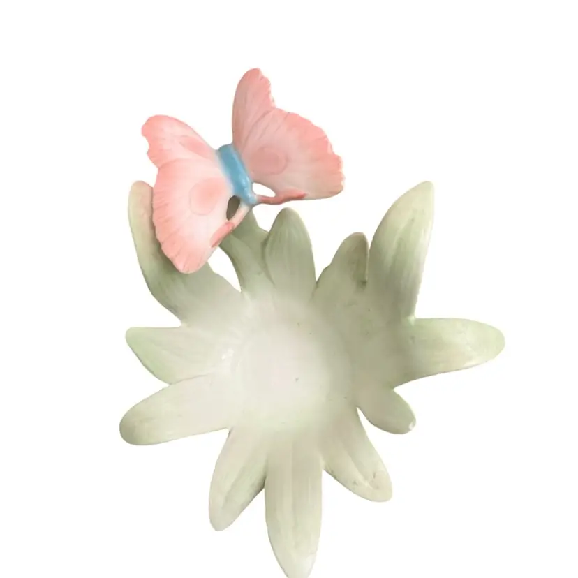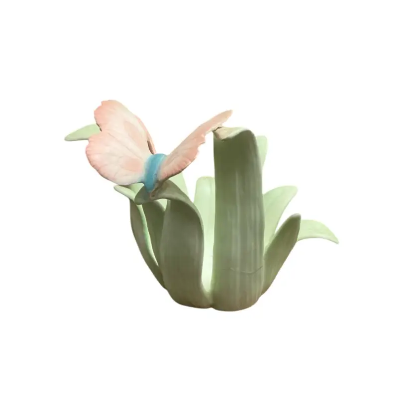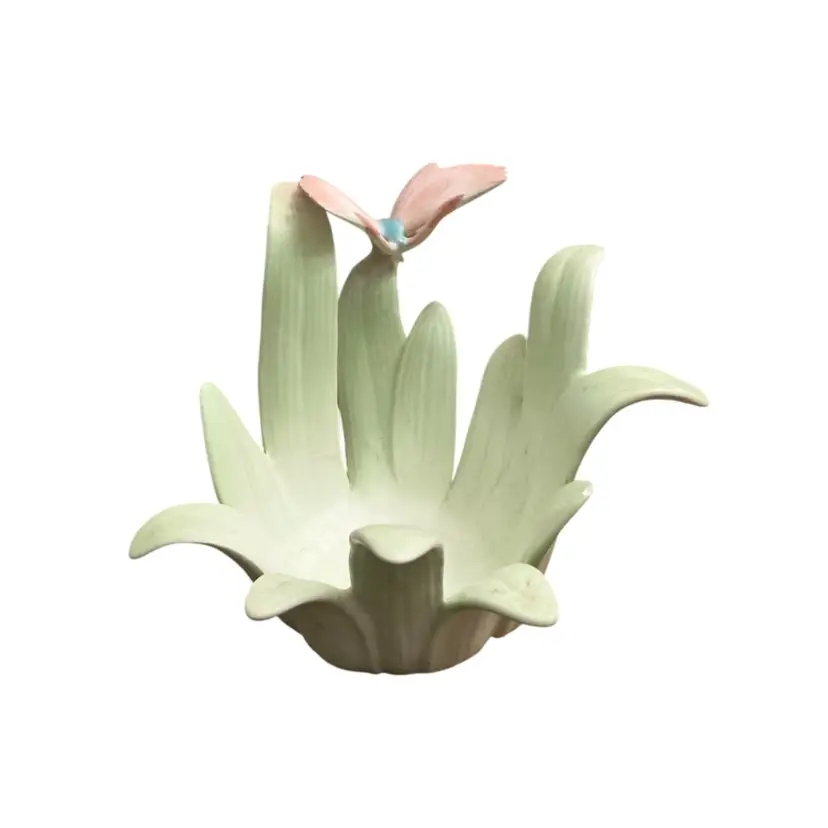 Beautiful pink butterfly on green leaves porcelain candle holder. Has repair on base of one leaf stem. Crack across bottom that has been glued back together.
