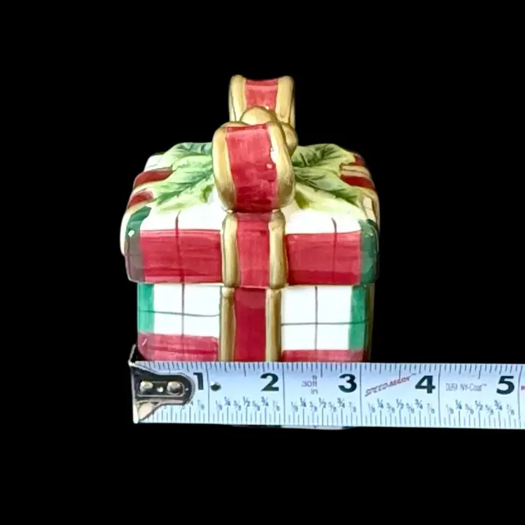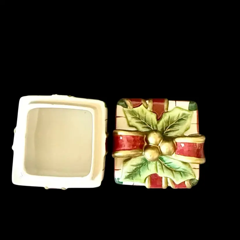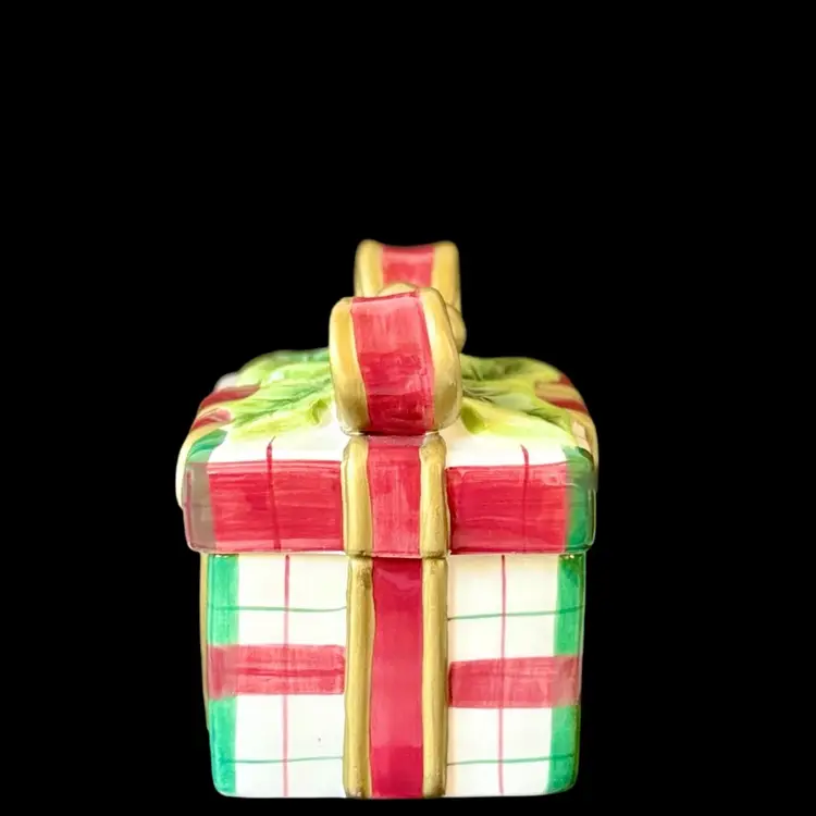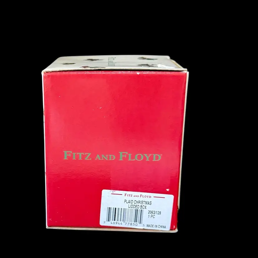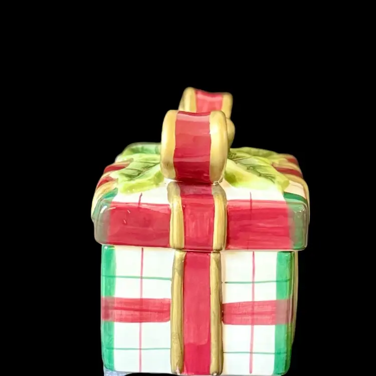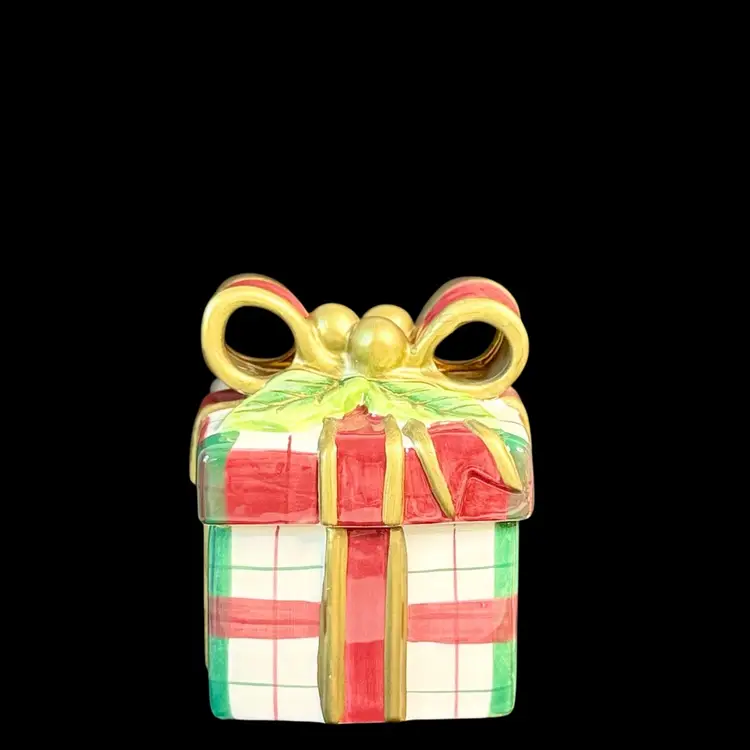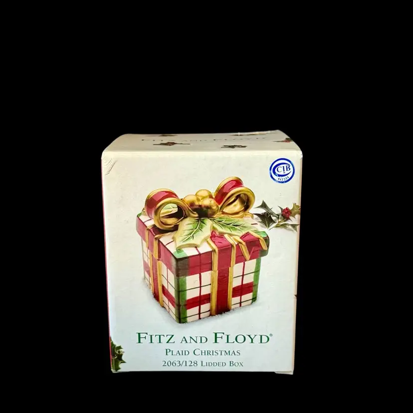 Vintage Fitz And Floyd Plaid Christmas Lidded Trinket Box Present Bow Holly Ceramic Red, White, Green. With box.