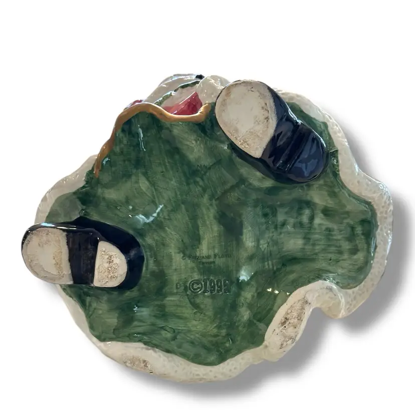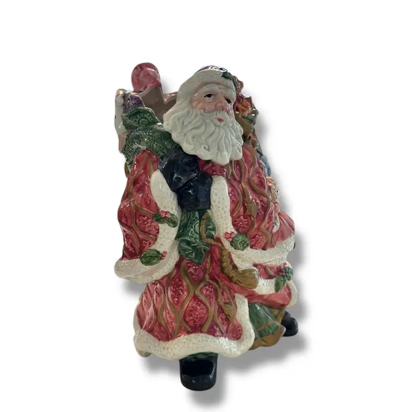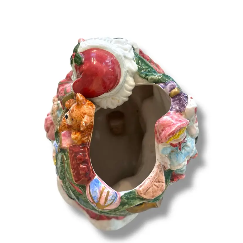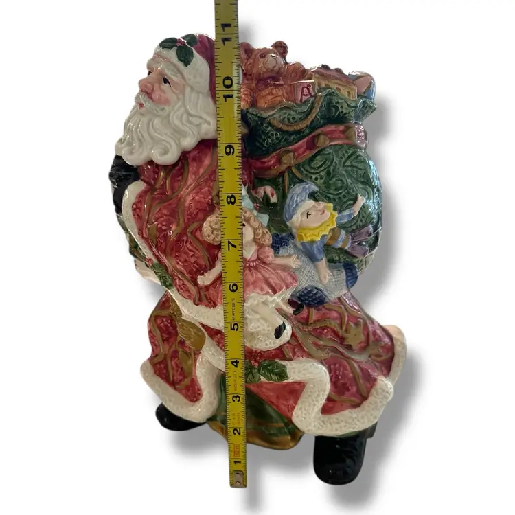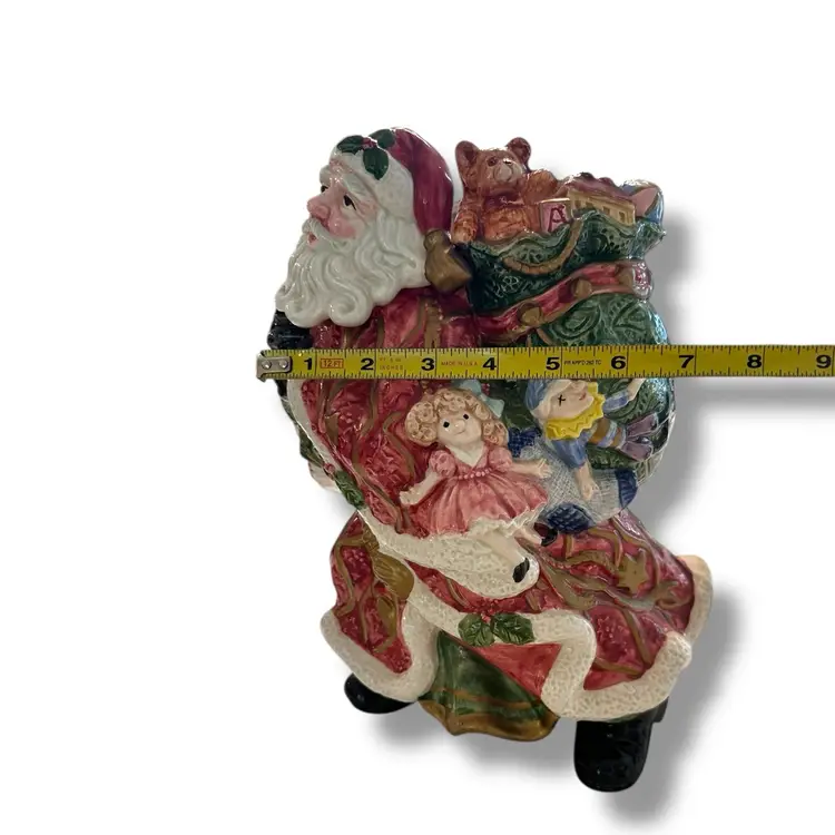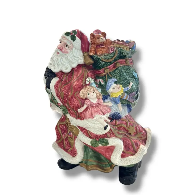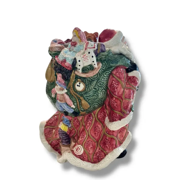 The Fitz and Floyd Santa Claus Cookie Jar Kris Kringle from 1995 is a large ceramic and porcelain canister with a traditional Christmas theme. Standing at 11 inches tall and 7 inches wide, this multicolored jar features a Santa Claus shape and Kris Kringle character, perfect for adult collectors looking to add a festive touch to their kitchen storage. Made by Fitz & Floyd, this vintage cookie jar captures the nostalgia of Christmas toys from the 1990s, making it a charming and unique addition to any collection. This will be carefully packaged and shipped right away