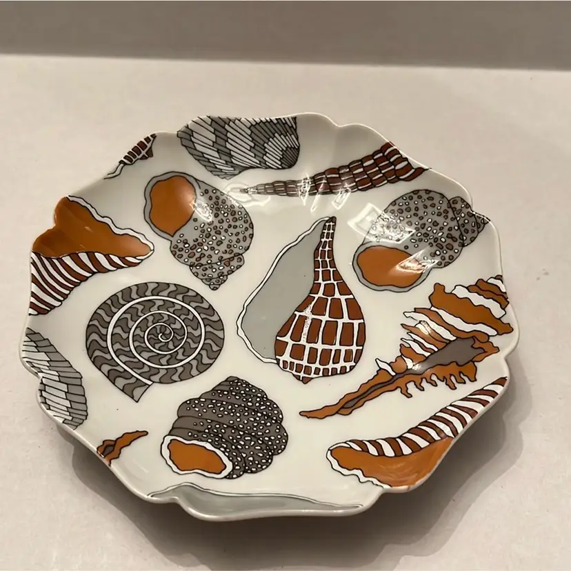 This is a shell shape dish with sea shells that are in colors of brown, white and grays. Excellent used condition