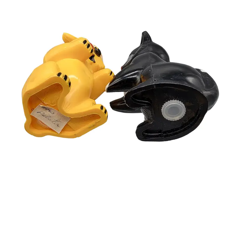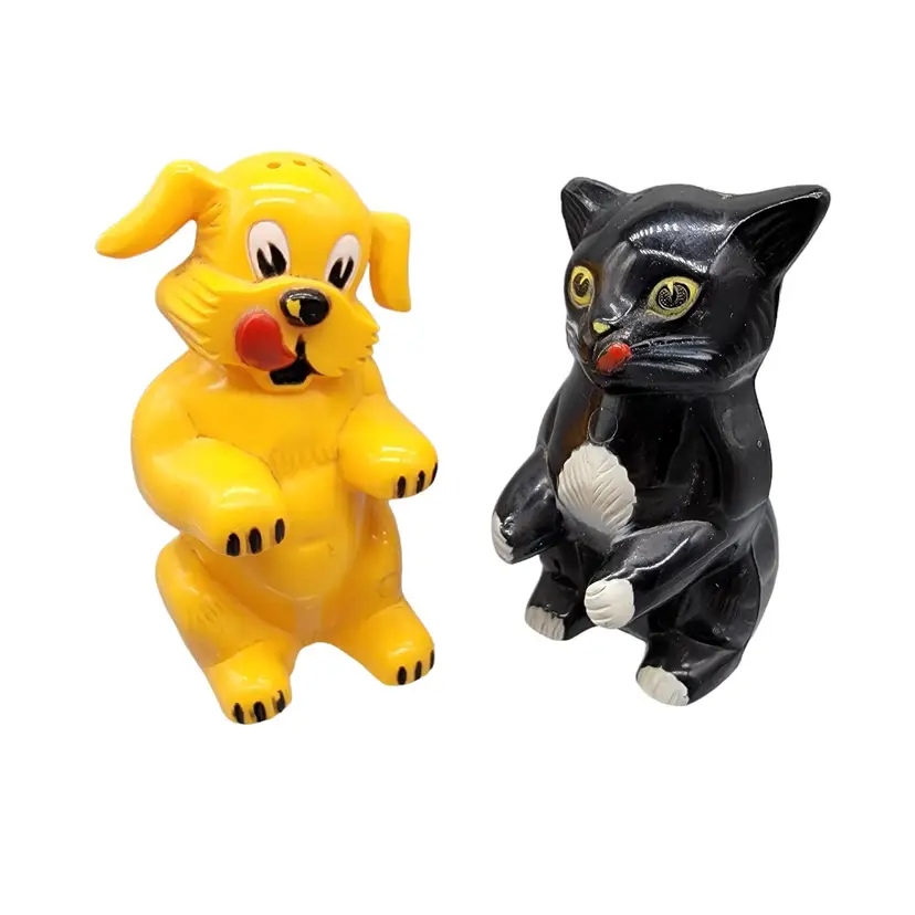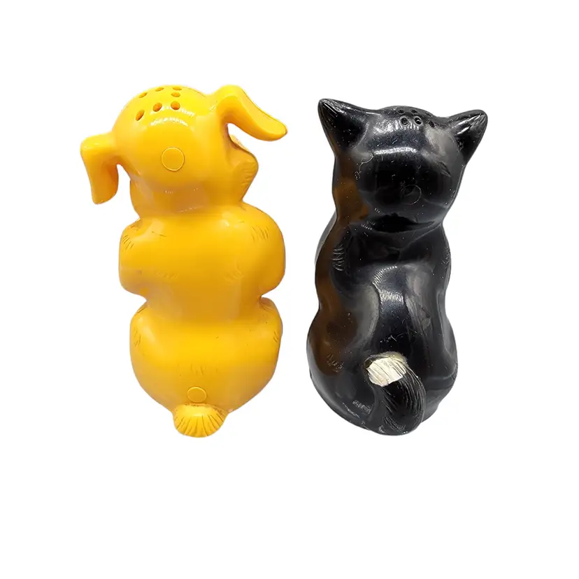 Cute set of vintage kitsch Fitz & Floyd cat dog molded plastic salt & pepper shakers. Condition: pre-owned; good condition, paint is in good condition, no chips or cracks. Measurements approximately: 3.5" tall, 1.5" long, 1.75" long SKU: Shakers-B