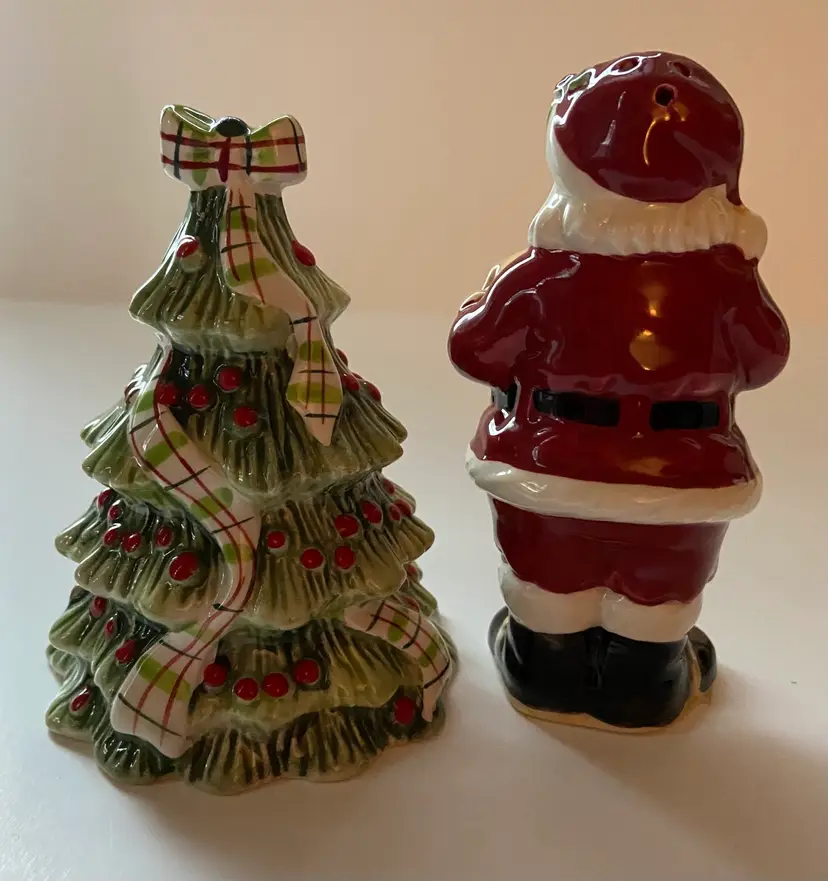 Set of Fitz and Floyd salt & pepper shakers depicting Santa and a Christmas tree. Like new condition. Fun addition to your holiday table.