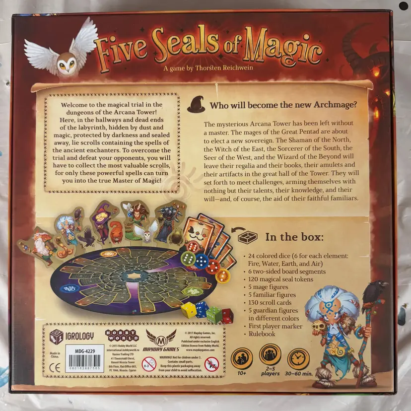 The "Five Seals of Magic" board game by Mayday Games is a fantasy-themed game designed for 2 or more players aged 10 and up.