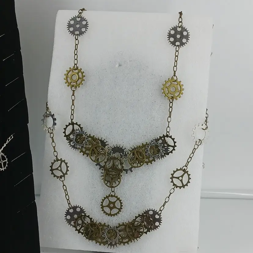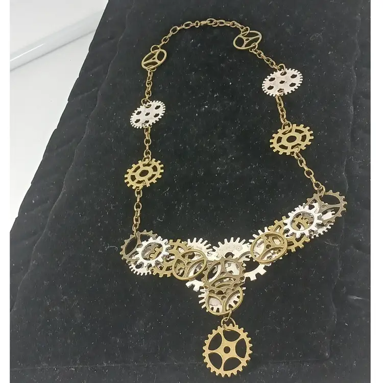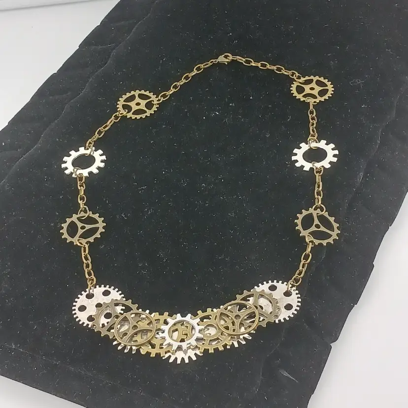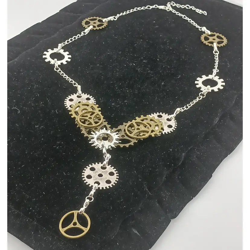 SPN-1505 – A touch of Class. Base of necklace is 4 1/4" x 1 3/4" and is made up of 3/4" to 1" diameter bronze and silver plated gears. More of the same gears have been linked with bronze chain to form this 21 1/2" necklace.