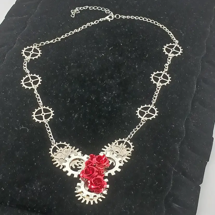 SPN-1501 – The sweeter side of Steampunk. A nesting of aluminum red roses sit above a cluster of silver plated gears of different sizes that form a “Y”. Largest gear is 1" in diameter. Base of necklace is suspended from silver plated chain with 3/4" diameter silver plated gears which have been linked between chain to form this 20 inch necklace.
