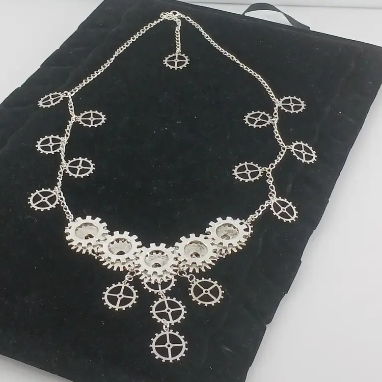 SPN-1503 – A bit more delicate, this necklace is perfect for a dressy time. The 4 ¼ x 2 ¼ inch base is make up of silver plated gears with ¾ inch in diameter gears which dangle from the lower half of base. Lowest dangles is 1 ¾ inches from base. Silver plated chain with same gears dangling from chain make this 25 inch necklace. With added extension chain this necklace can go from 20 inches to 28 inches.