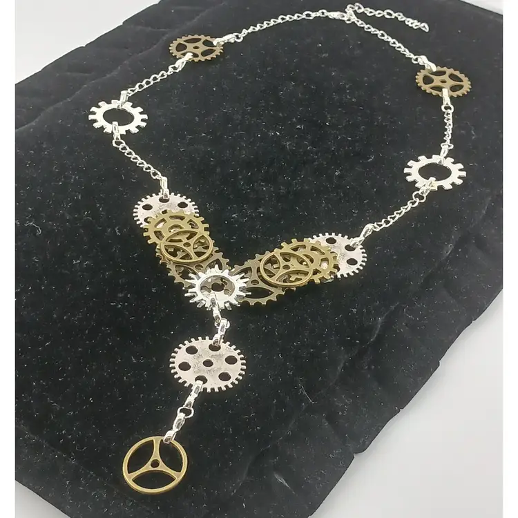 SPN-1502 – Gears and links. Bronze plated and silver plated gear wheels ranging from 3/4" to 1" in diameter have been mounted together to make the base of this necklace. More gears have been linked together with silver plated chain to make this a 20 inch necklace and an addition 2 1/2" extension chain has been added to extend to 22 1/2". Two more gears have been linked with chain to form a 3 1/2" drop from the lowest gear in the base.