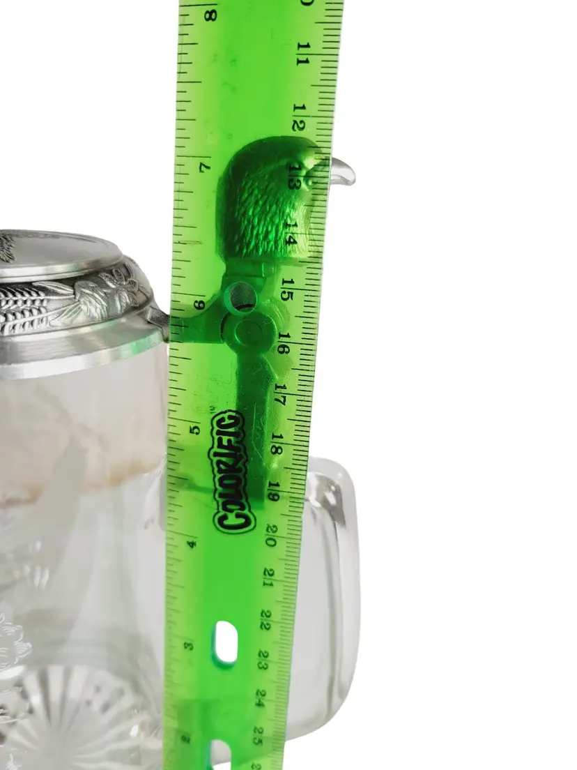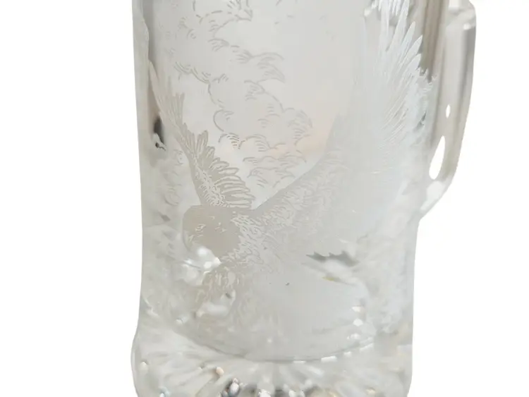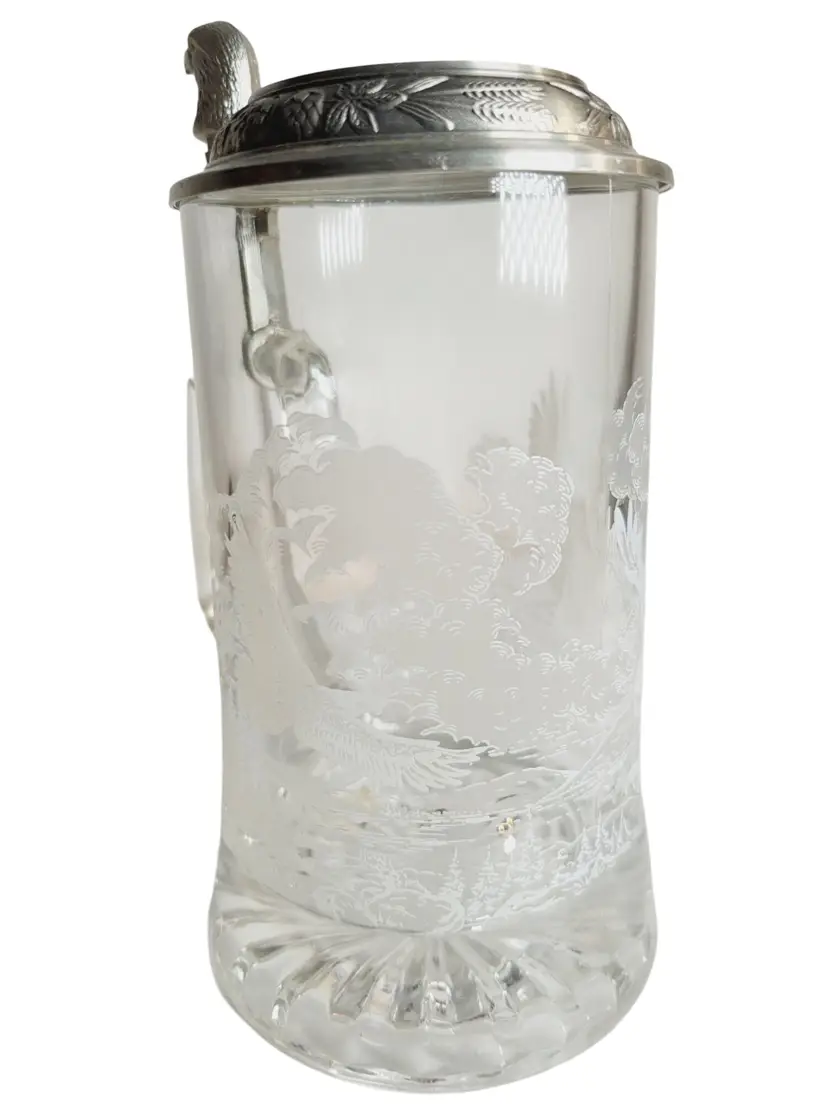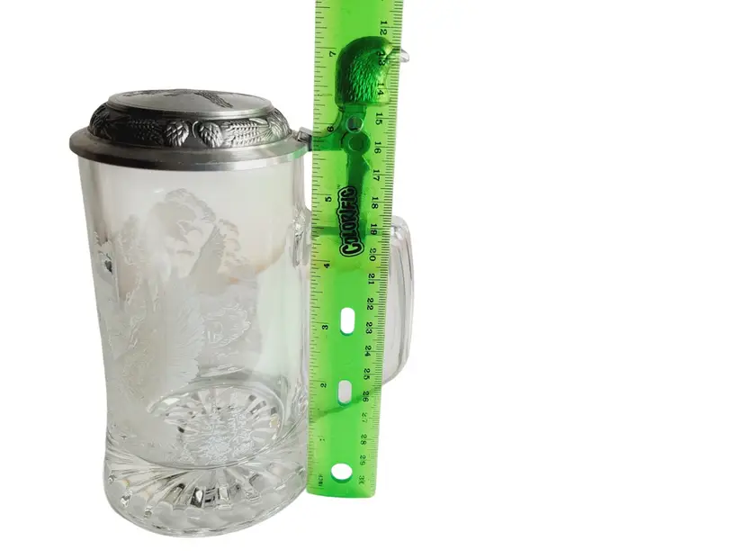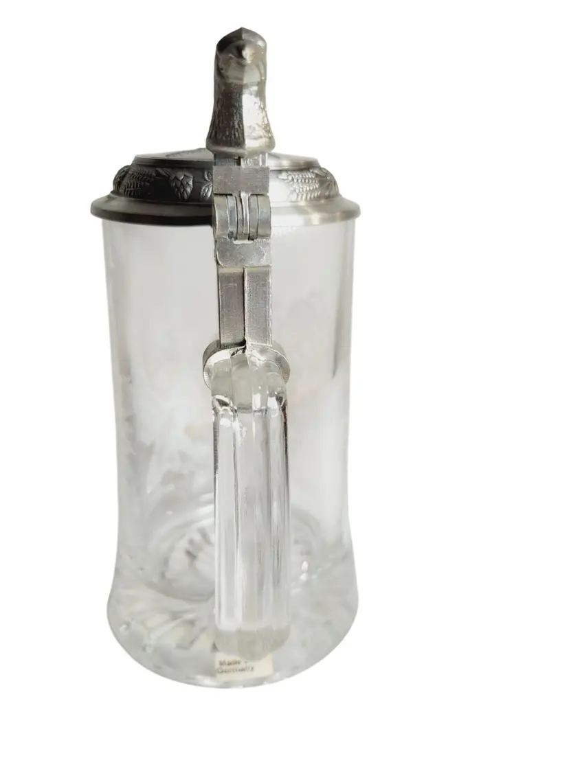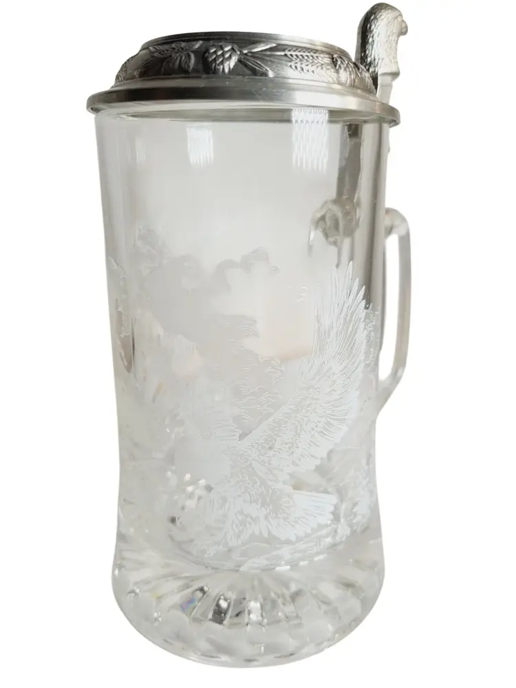 • Features a pewter lid with an eagle design • Made in Germany • 7 inches tall • Intricate eagle engraving on glass • Sturdy glass construction No chips or cracks, excellent condition