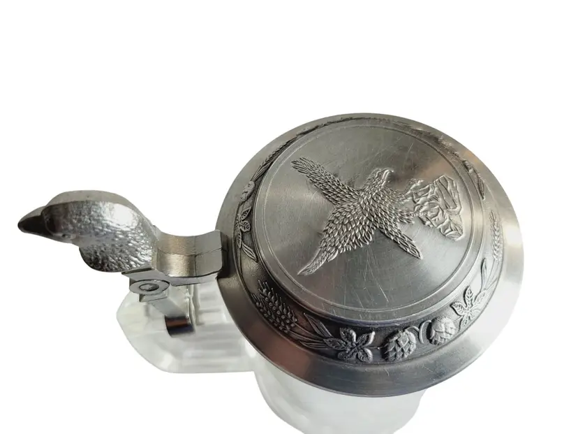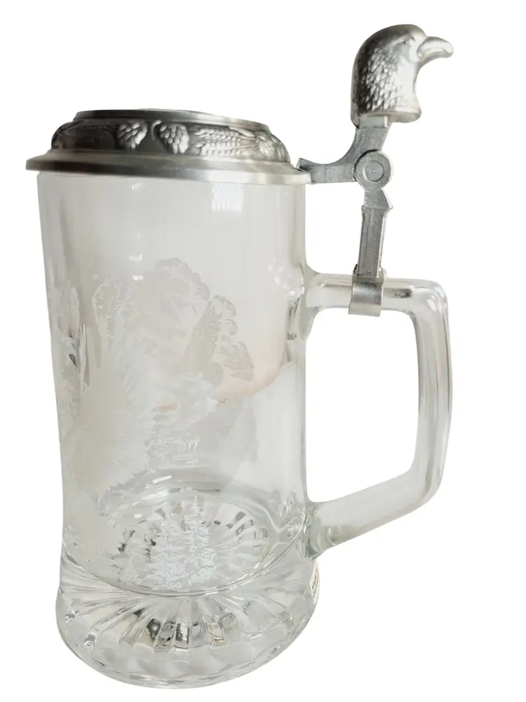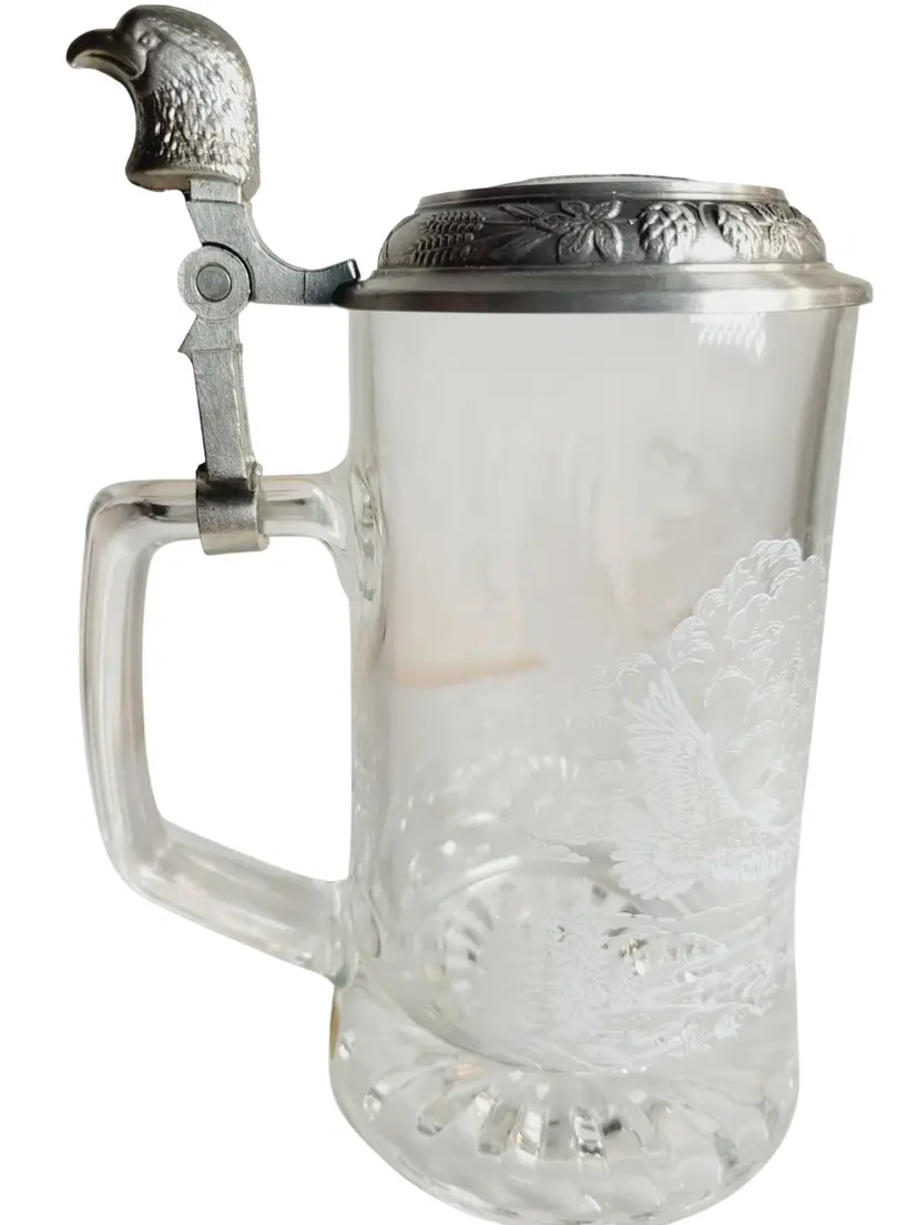 This vintage Fiye Eagle beer stein boasts intricate etchings of a majestic eagle in flight, complemented by a detailed pewter lid with an eagle motif. Crafted in Germany, it exemplifies traditional craftsmanship, making it a unique collector's item. Its sturdy glass construction and pewter accents speak to its era's quality and style, offering both functionality and aesthetic appeal.