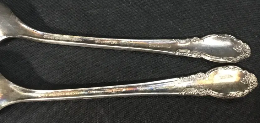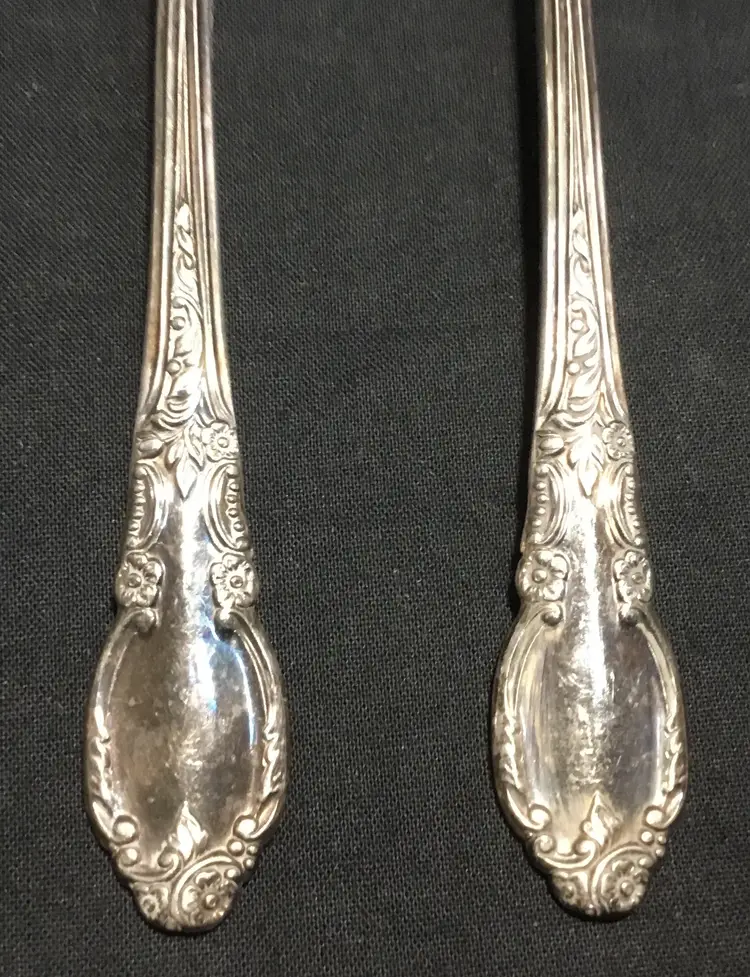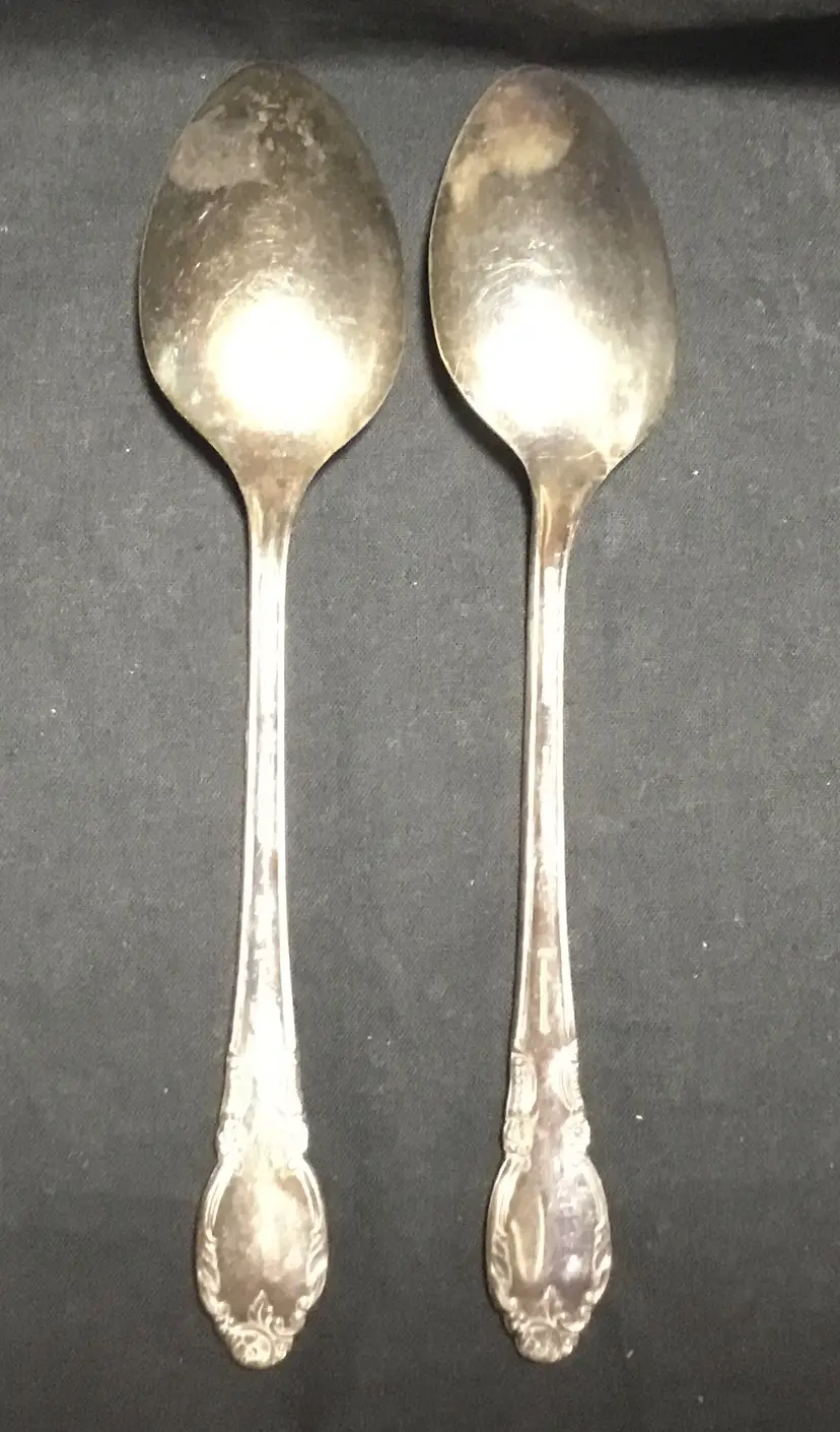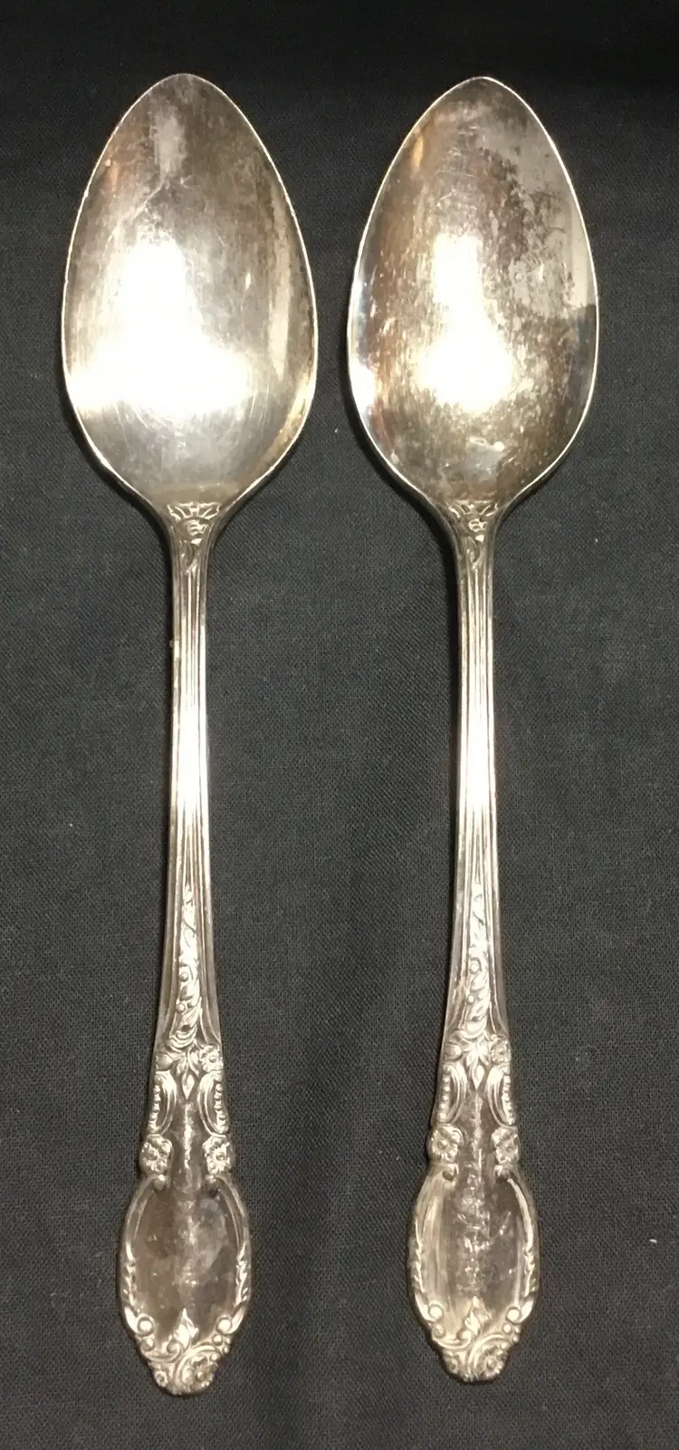 Lot of 2 serving or soup spoons, 7.5 inches long, bowl of spoon is 2.5 by 1.5 inches. Made by Rogers Company, Oneida, Ltd. 1980s