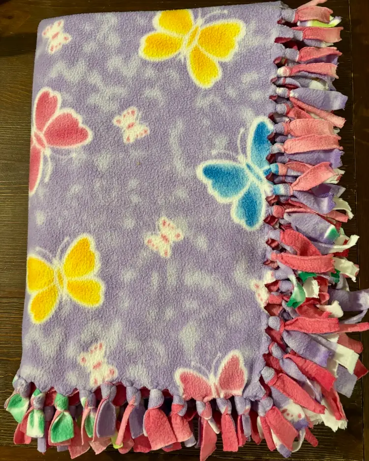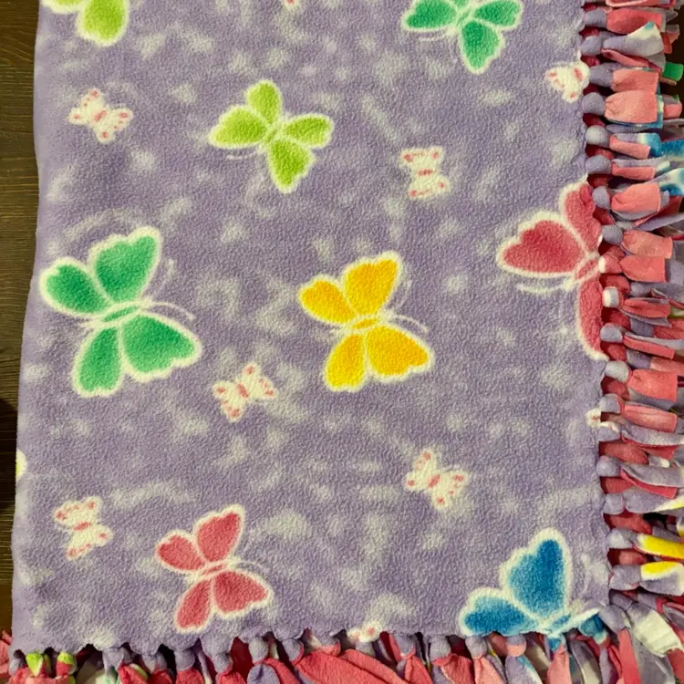Approx. 45”x 55” Fleece Throw Blanket Butterfly Pattern No Sew Hand Tied Pink Purple Multi Colored Laundered by me Smells fresh and clean! No stains,tears or holes!